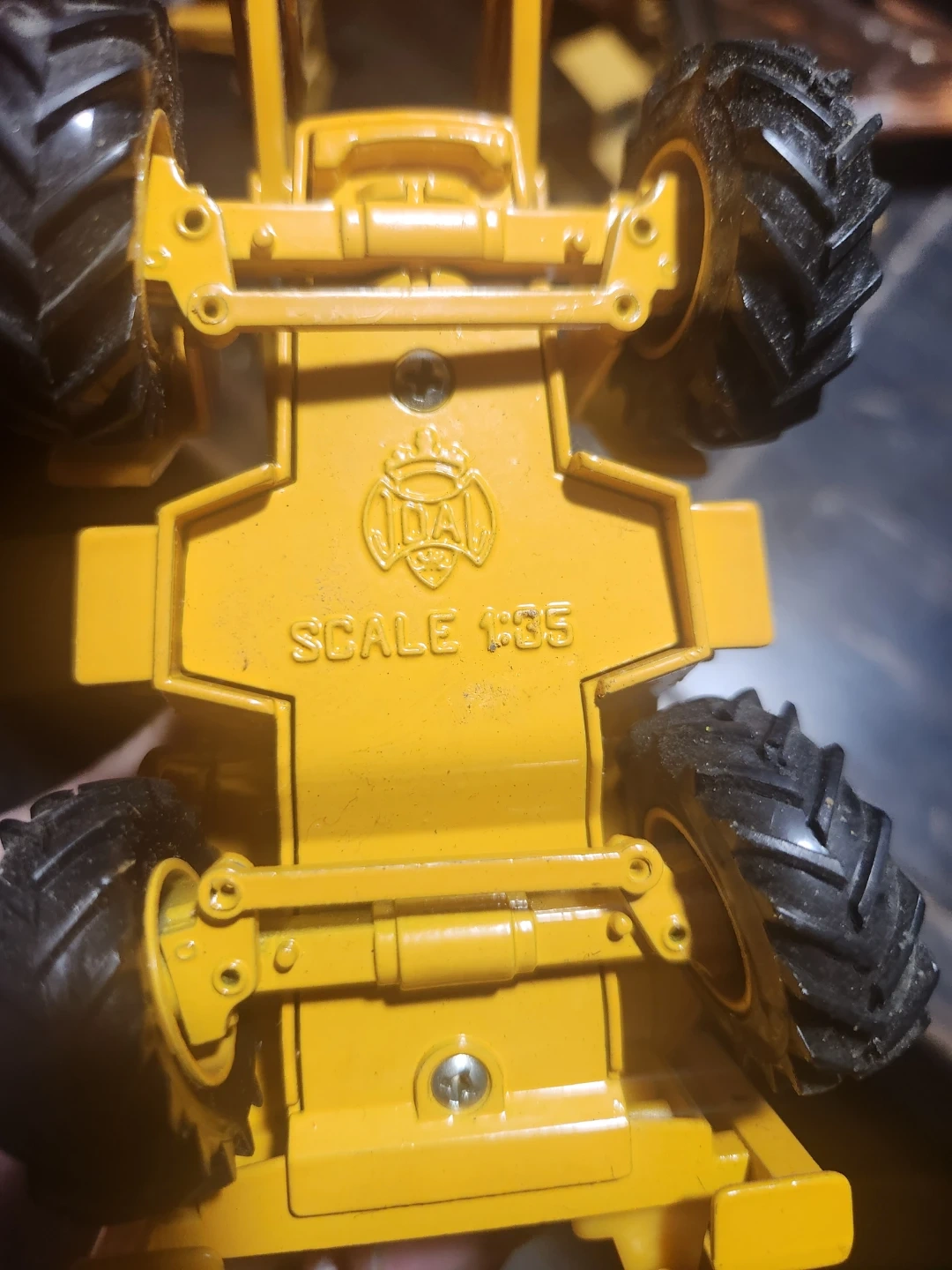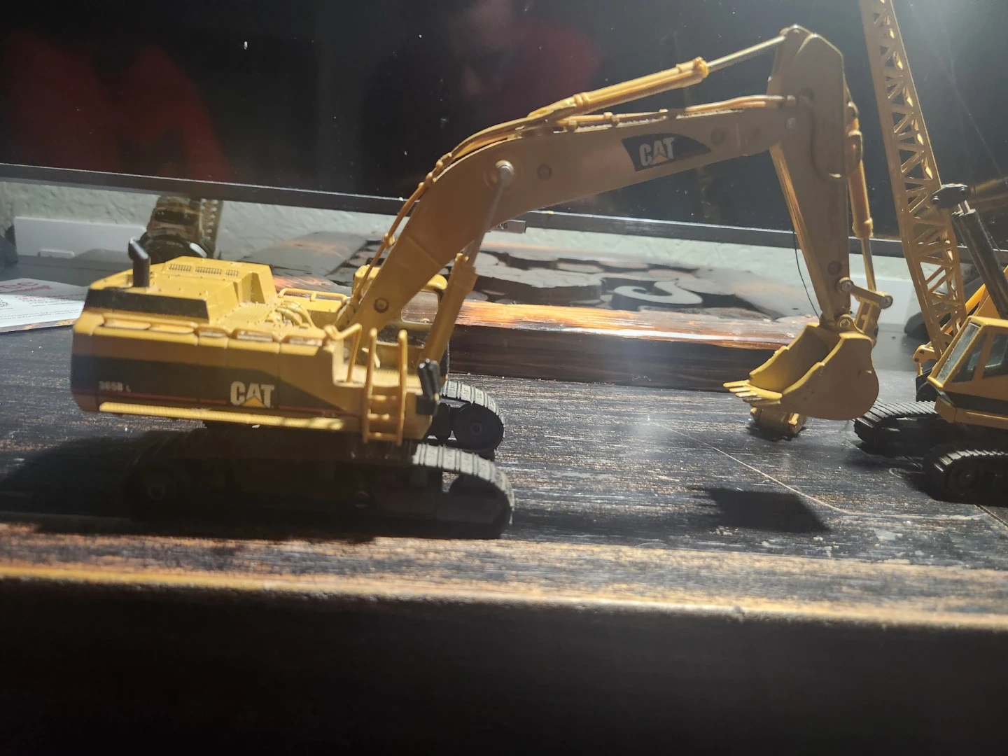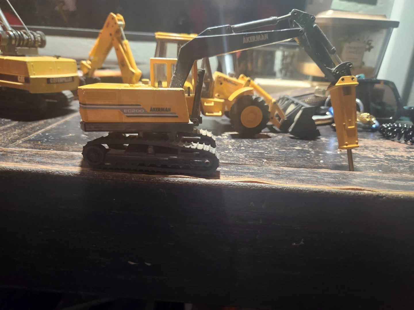 Die-cast metal toy construction vehicles. Includes a yellow Akerman EC200 excavator with tracks and a yellow JCB backhoe loader. Both feature articulated arms and buckets. Scale 1/35 and 1/50 never been played with always on display. Pick up only cash only.