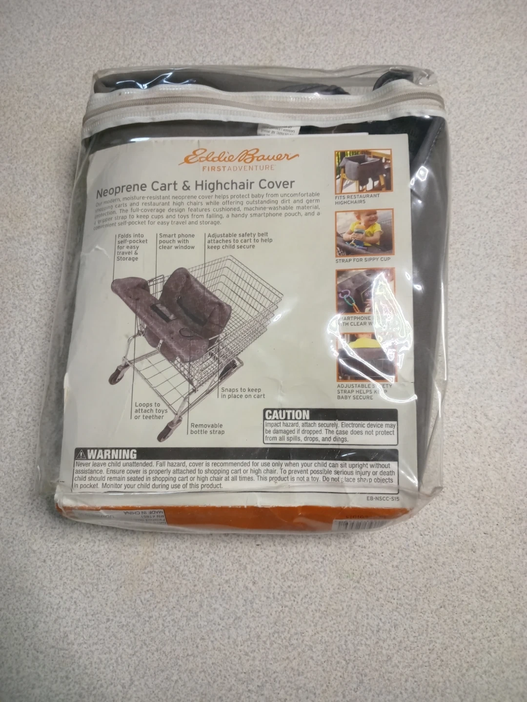 10Keep your little one comfy and clean with this Eddie Bauer Neoprene Cart & Highchair Cover! It's designed to protect your baby from dirt and germs while you're out and about. This cover fits restaurant highchairs and folds into a self-pocket for easy travel and storage. It also features an adjustable safety belt to keep your little one secure and loops for attaching toys or teethers. Brand new in packaging!