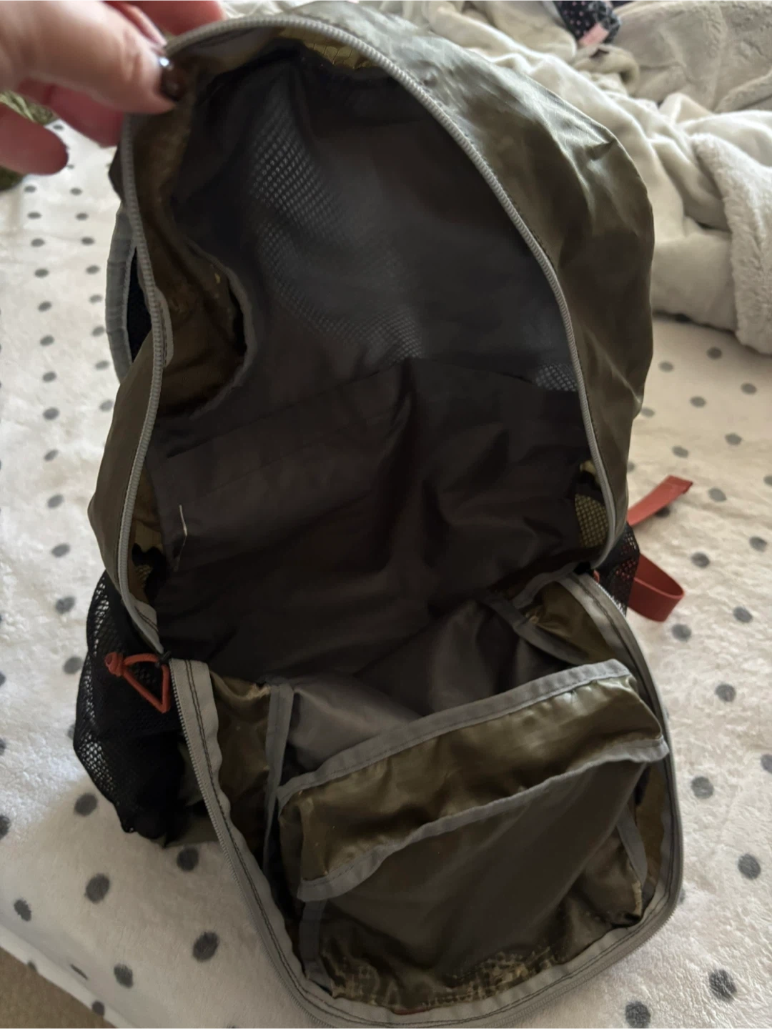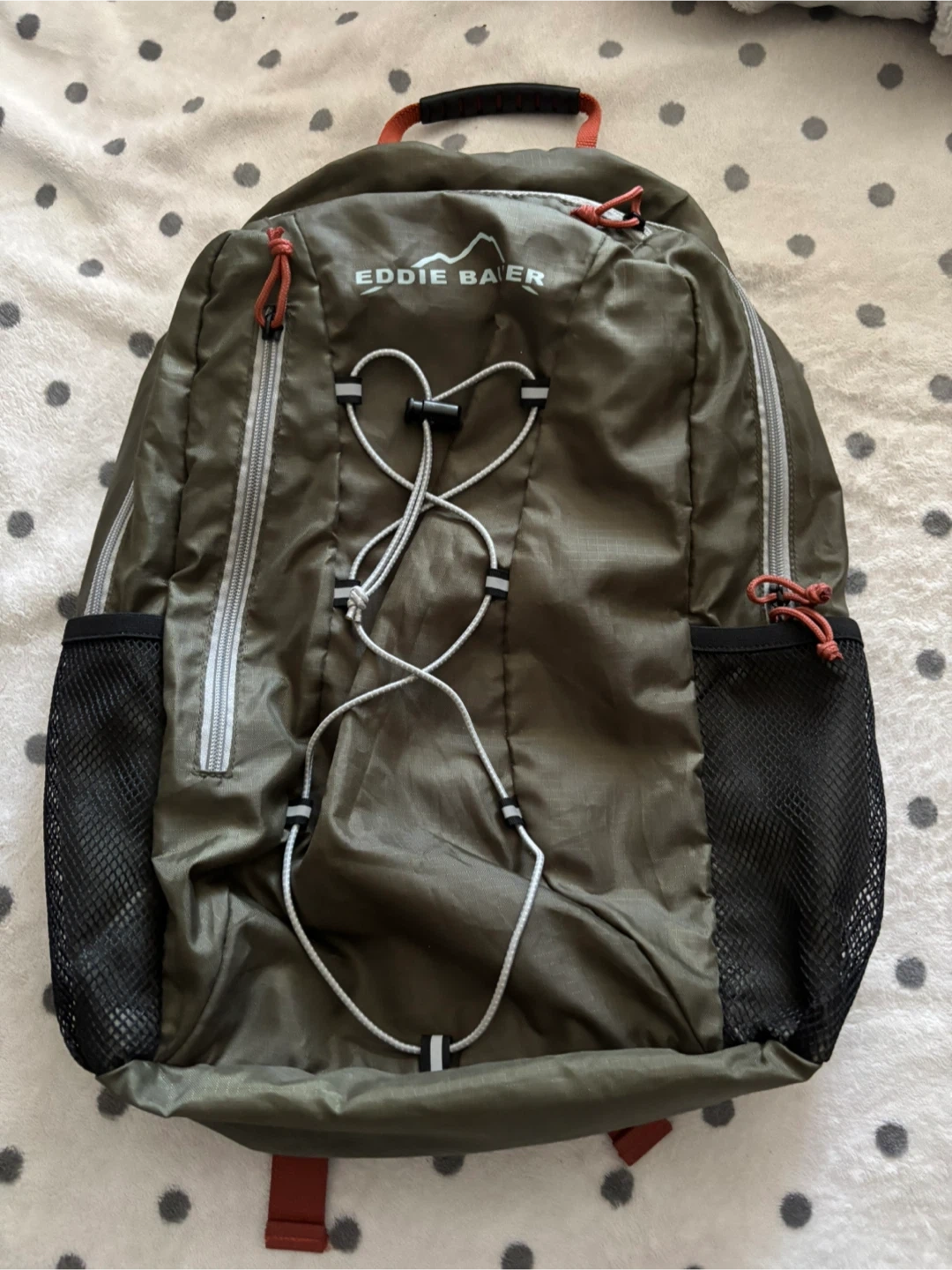 This Eddie Bauer packable backpack is great for travel or everyday use! It's lightweight and easy to store when not in use. It features mesh side pockets, adjustable straps, and a front zippered pocket. Perfect for hiking, camping, or just running errands around town