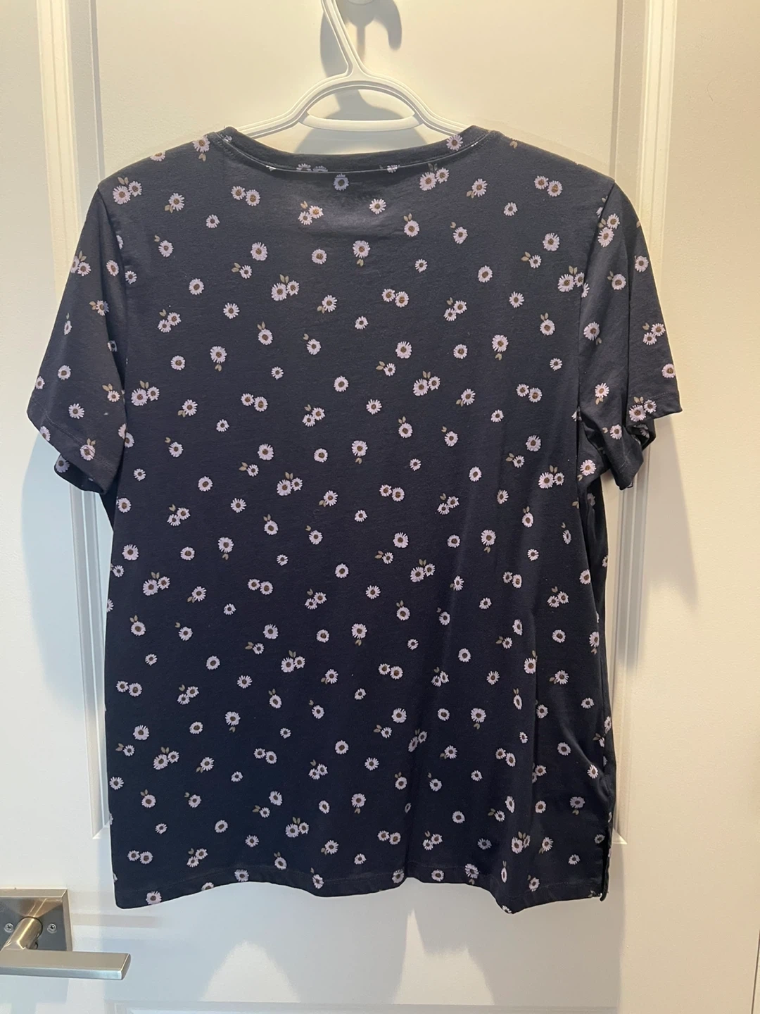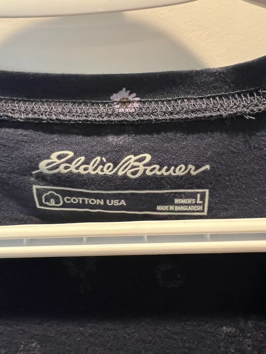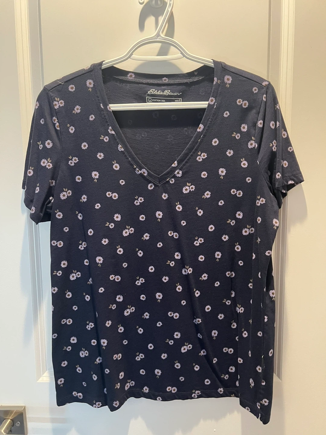 Selling an Eddie Bauer women's T-shirt in size large. It's a navy colour with a cute floral pattern. Made of cotton, it's super comfy.