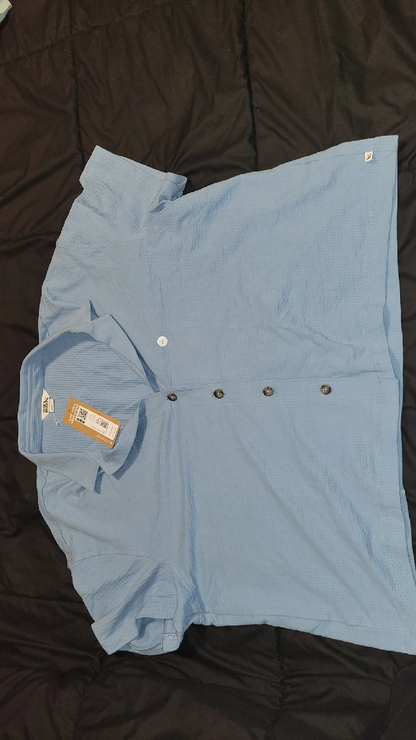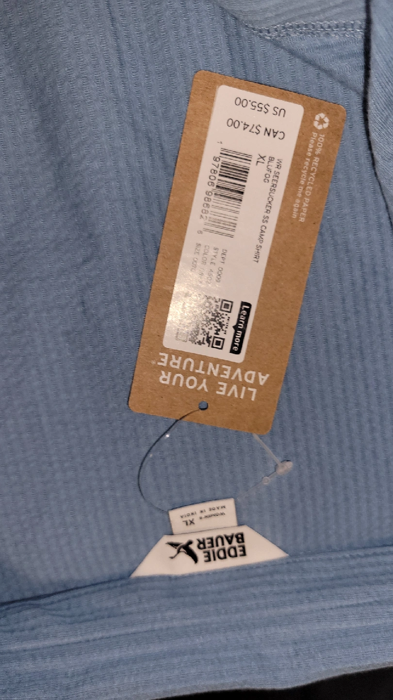 75Selling a brand new with tags Eddie Bauer wrinkle-resistant seersucker camp shirt in size XL! The shirt is a light blue colour. This shirt is perfect for a casual, comfortable look while still being wrinkle-resistant.