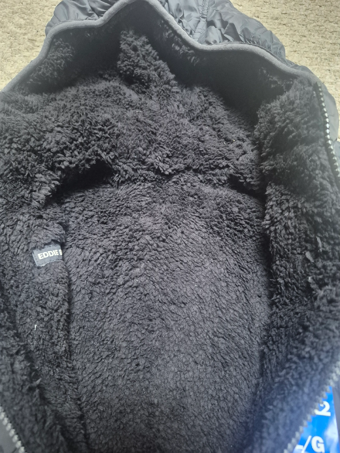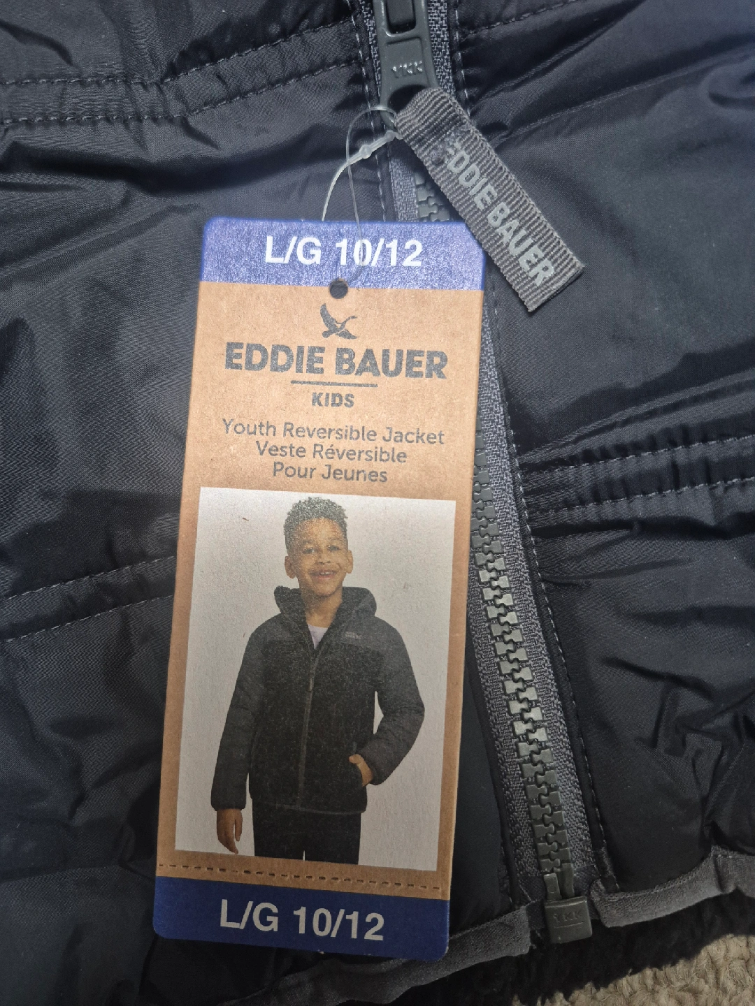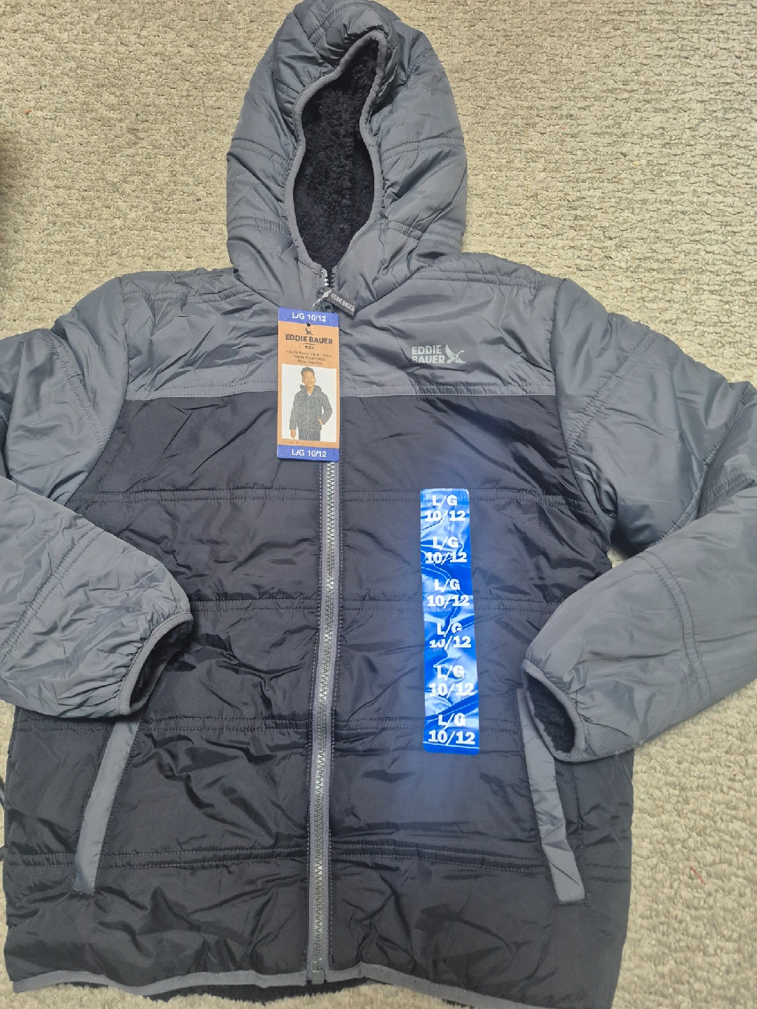 Brand new with tags! This Eddie Bauer youth reversible jacket is size Large (10/12). It features a cozy sherpa lining on one side and a smooth, quilted exterior on the other. The jacket is black and gray and perfect for keeping your little one warm and stylish during the colder months. Originally bought for $24.99
