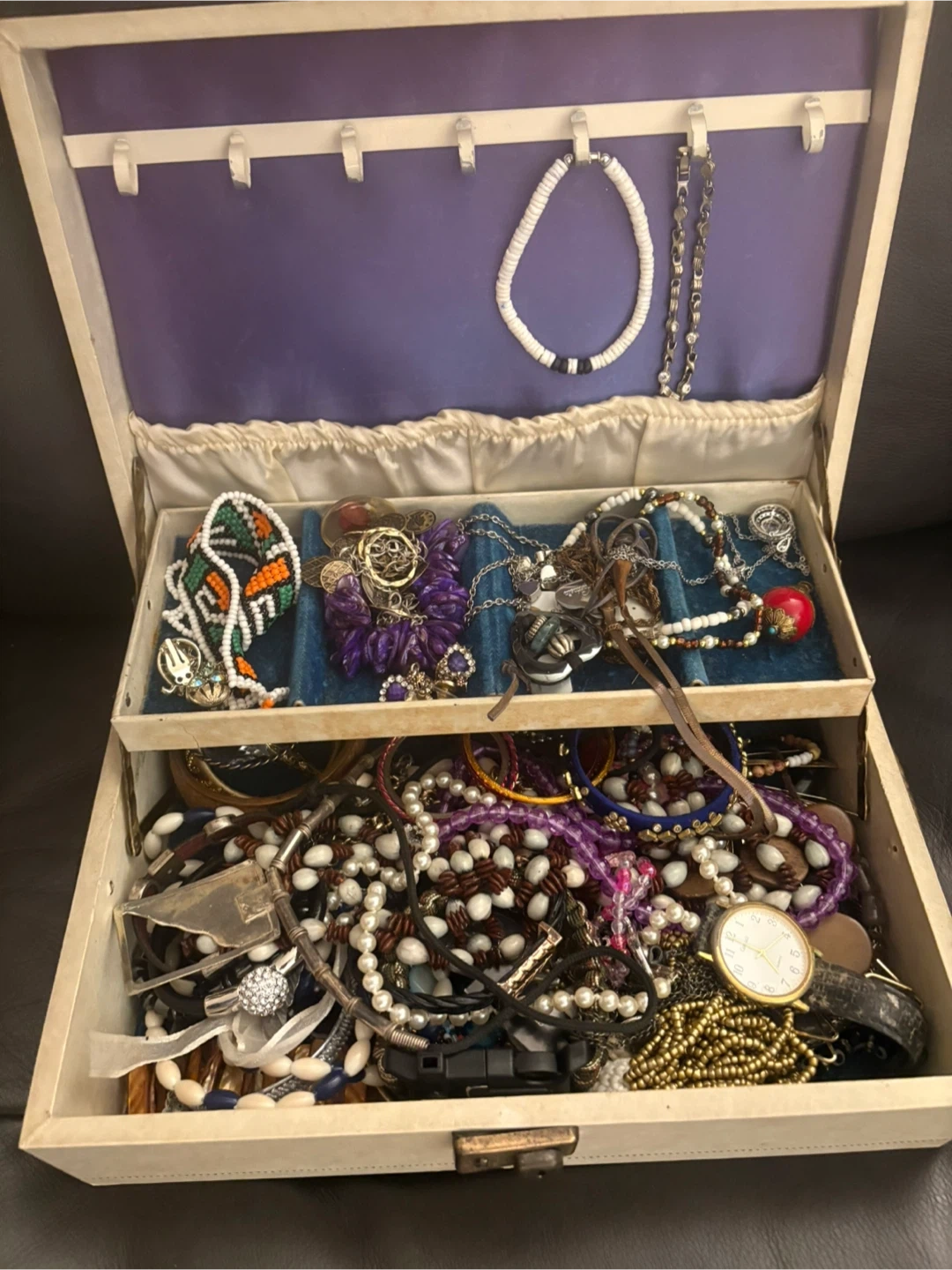 This is a jewellery box filled with a variety of costume jewellery. It's in a vintage style and contains necklaces, bracelets, and a watch. The box itself is cream-coloured with a purple fabric lining. Great for finding unique pieces!