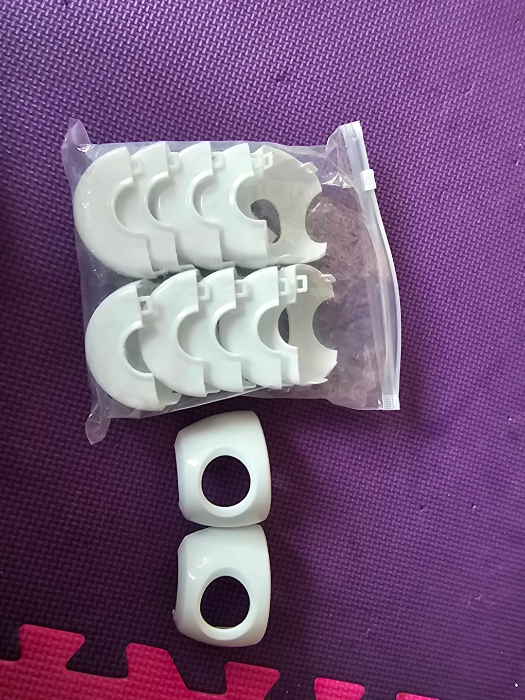 Includes eight white C-shaped cabinet door handles and two additional separate handles. They're made of plastic and designed for easy installation on drawers or cabinets. These would be useful for updating kitchen or bathroom cabinetry.