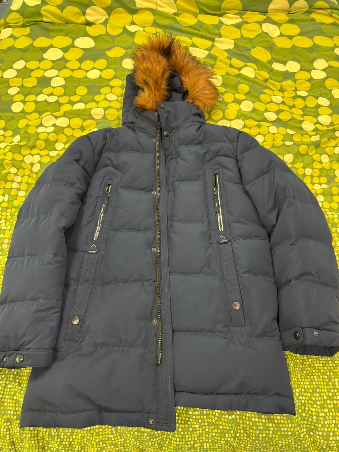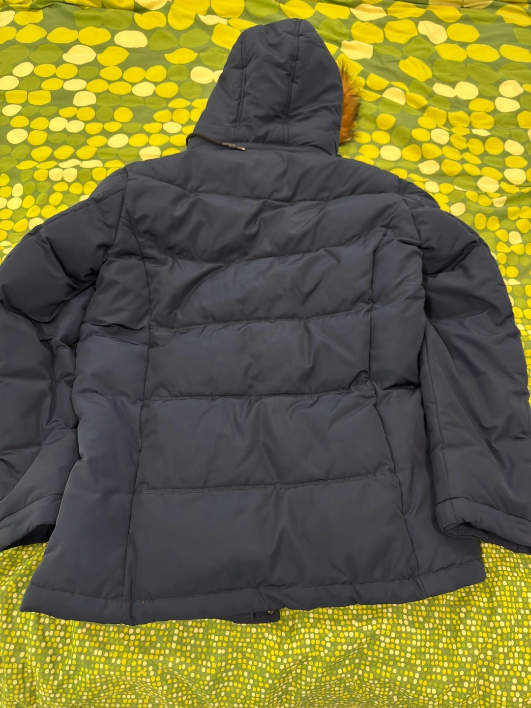 Here's a stylish and warm puffer jacket in size Large! It's perfect for staying cozy during the colder months. The jacket features a faux fur-trimmed hood It's in great condition and ready for a new owner