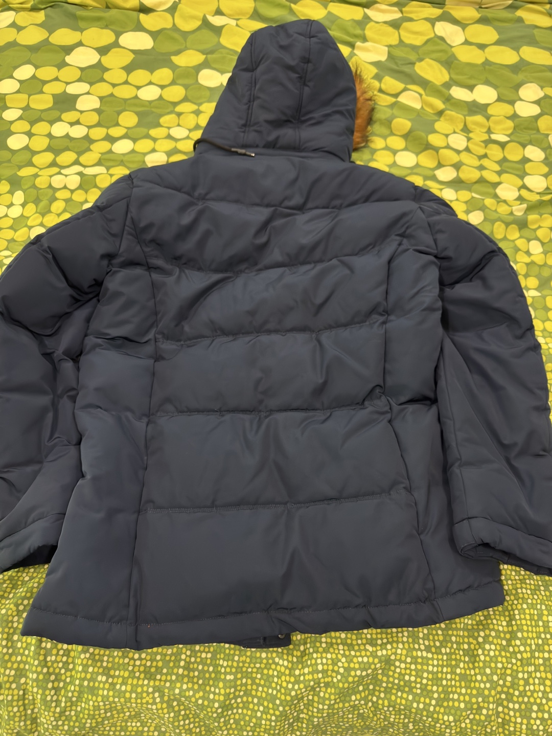 Here's a stylish and warm puffer jacket in size Large! It's perfect for staying cozy during the colder months. The jacket features a faux fur-trimmed hood It's in great condition and ready for a new owner