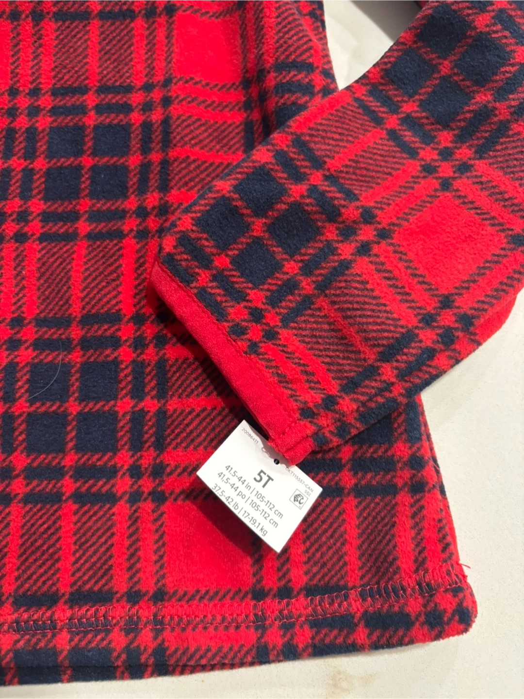 New with tag. Cozy OshKosh B'gosh fleece pullover for toddlers. Red and navy plaid pattern. Features a quarter-zip neckline. Size 5T.