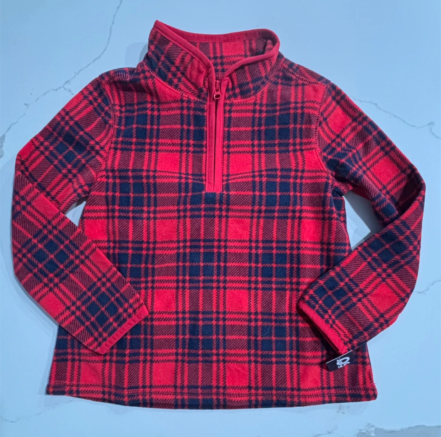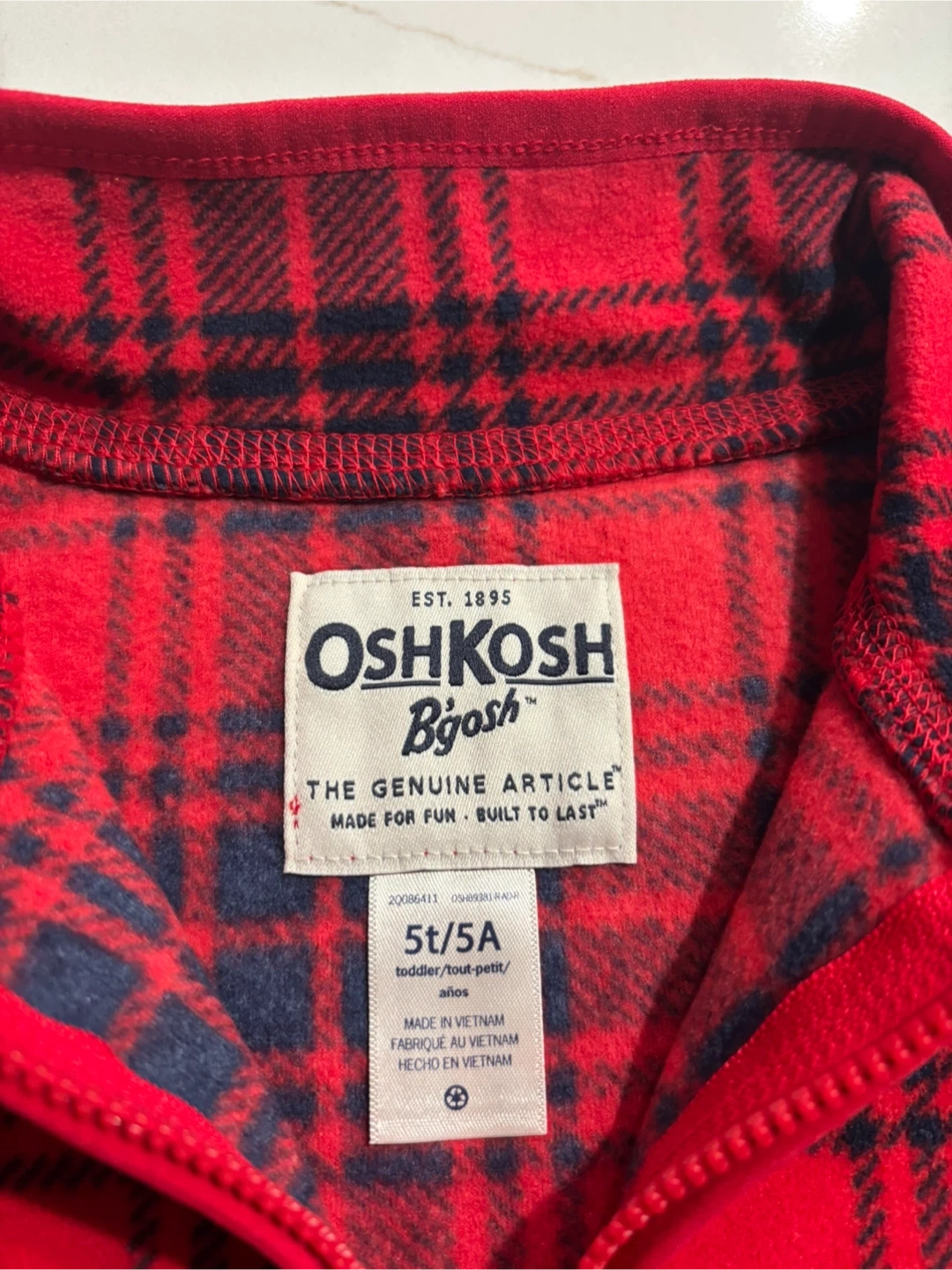 New with tag. Cozy OshKosh B'gosh fleece pullover for toddlers. Red and navy plaid pattern. Features a quarter-zip neckline. Size 5T.