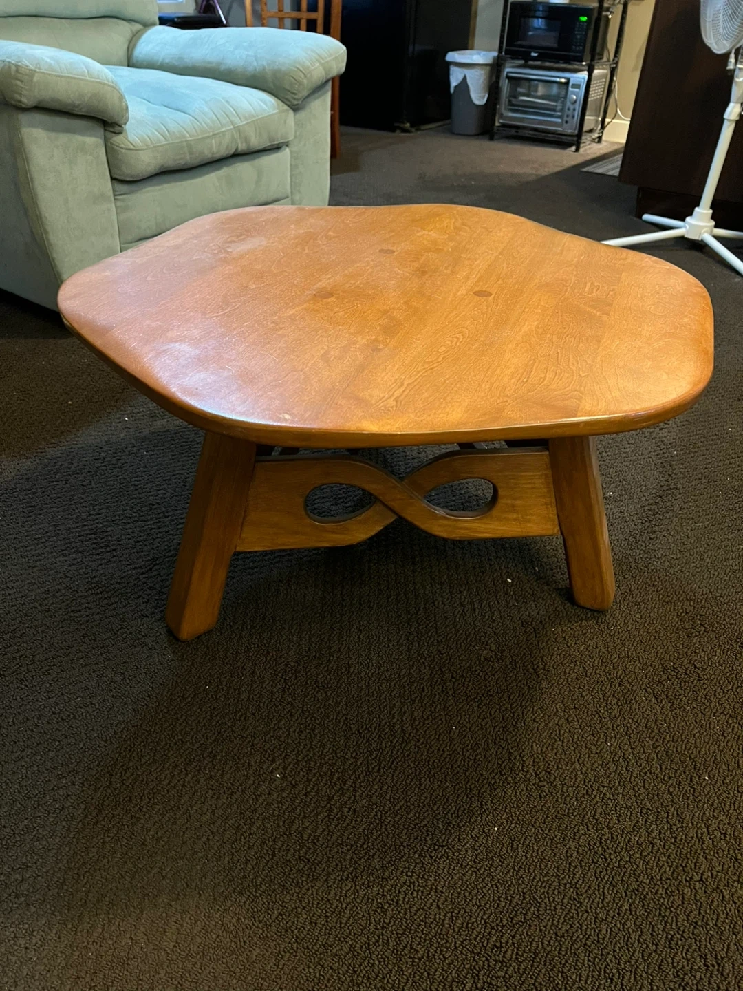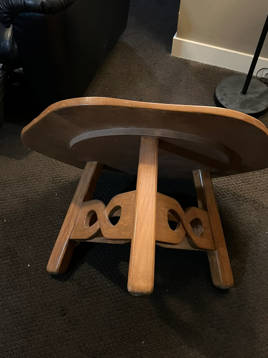 This is a unique wooden coffee table with a distinctive curved design and decorative leg supports. It's made of solid wood with a warm, natural finish. It's suitable for a living room or den. The surface measures approximately 32 inches across.