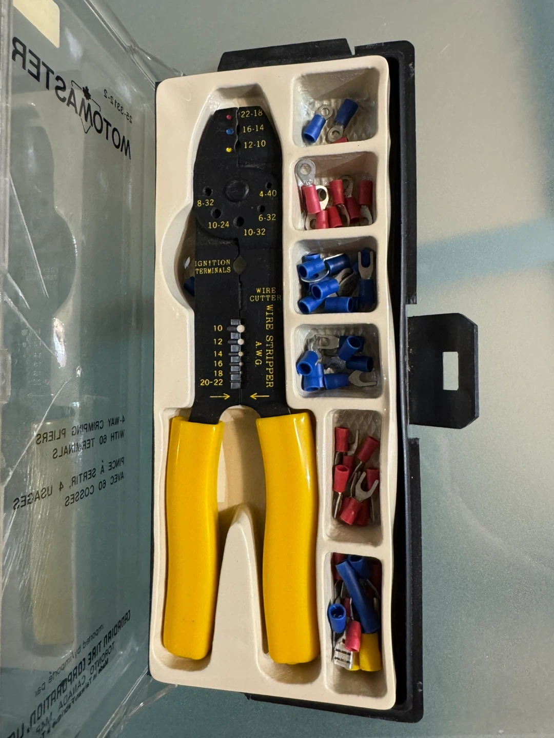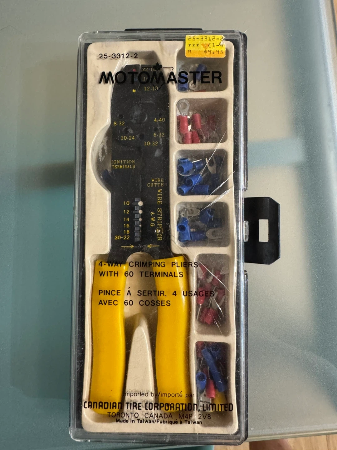 This Motomaster tool kit includes 4-way crimping pliers with 60 terminals. It's designed for ignition terminals and wire stripping. This kit is useful for automotive electrical work.