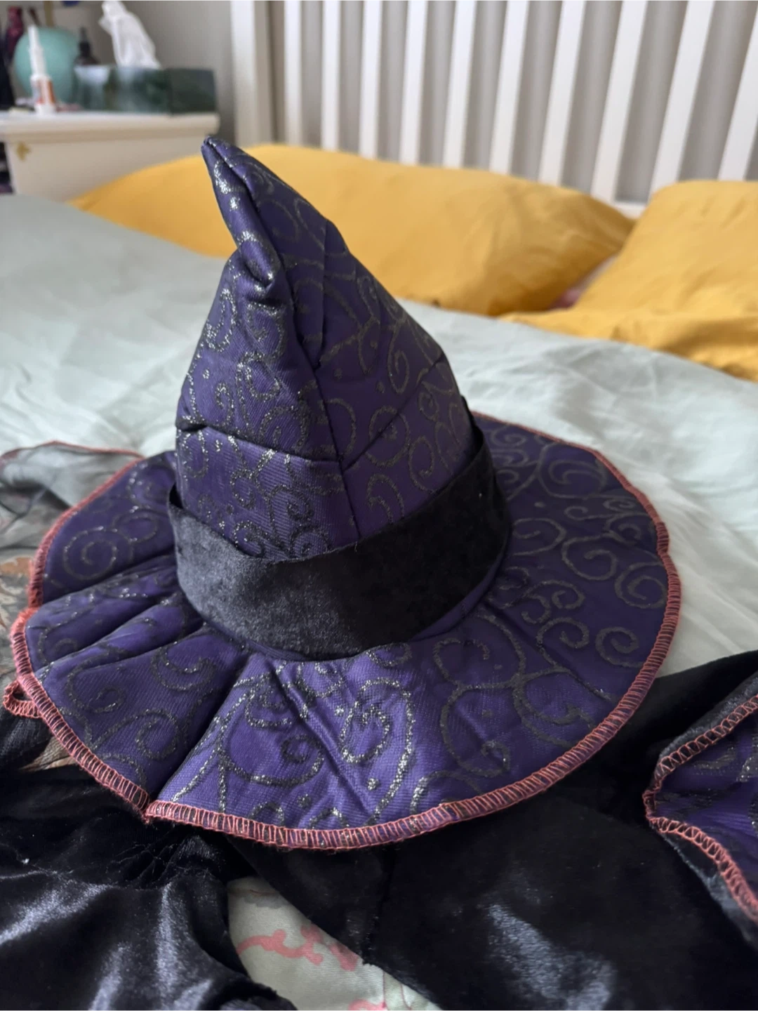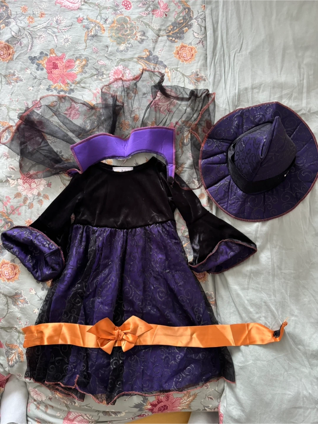 Selling a gently used California Costumes Hocus Pocus witch costume! This adorable costume includes the dress, capelet, and hat. Perfect for Halloween or dress-up play! It was used once, in perfect condition, like new. Size is for 3-5 year old kids but fits on a smaller 6-year-old kid as well.