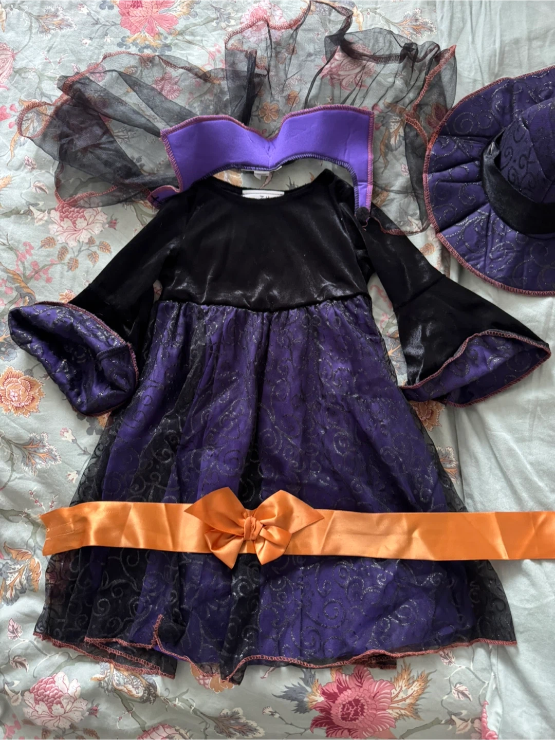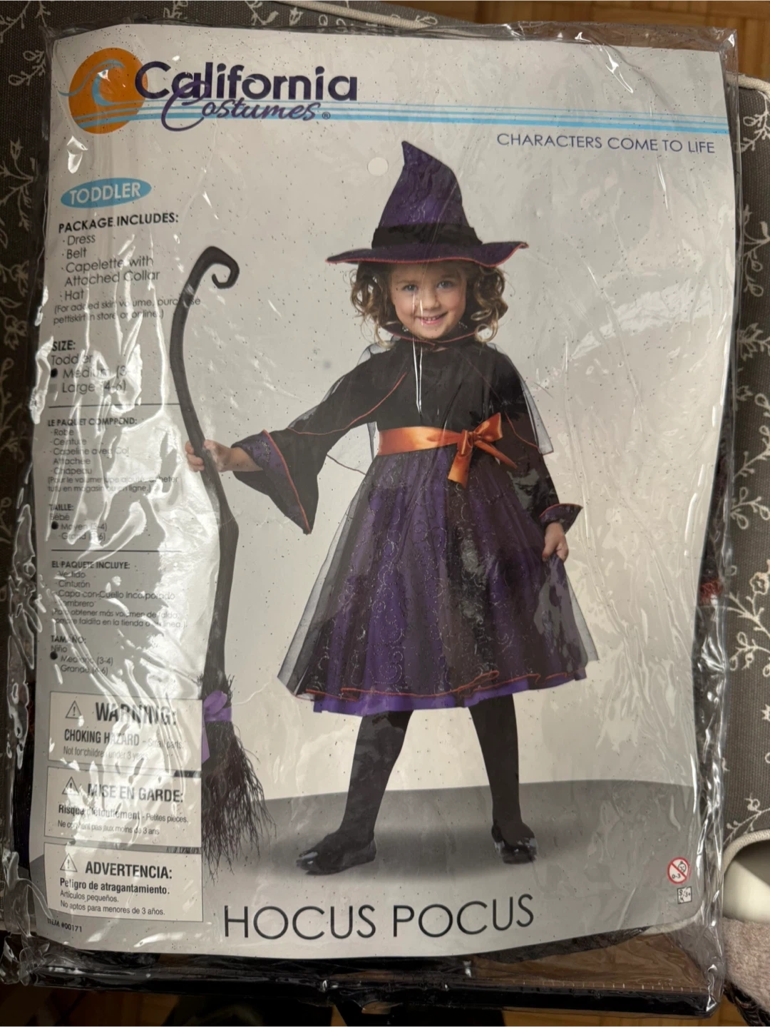 Selling a gently used California Costumes Hocus Pocus witch costume! This adorable costume includes the dress, capelet, and hat. Perfect for Halloween or dress-up play! It was used once, in perfect condition, like new. Size is for 3-5 year old kids but fits on a smaller 6-year-old kid as well.