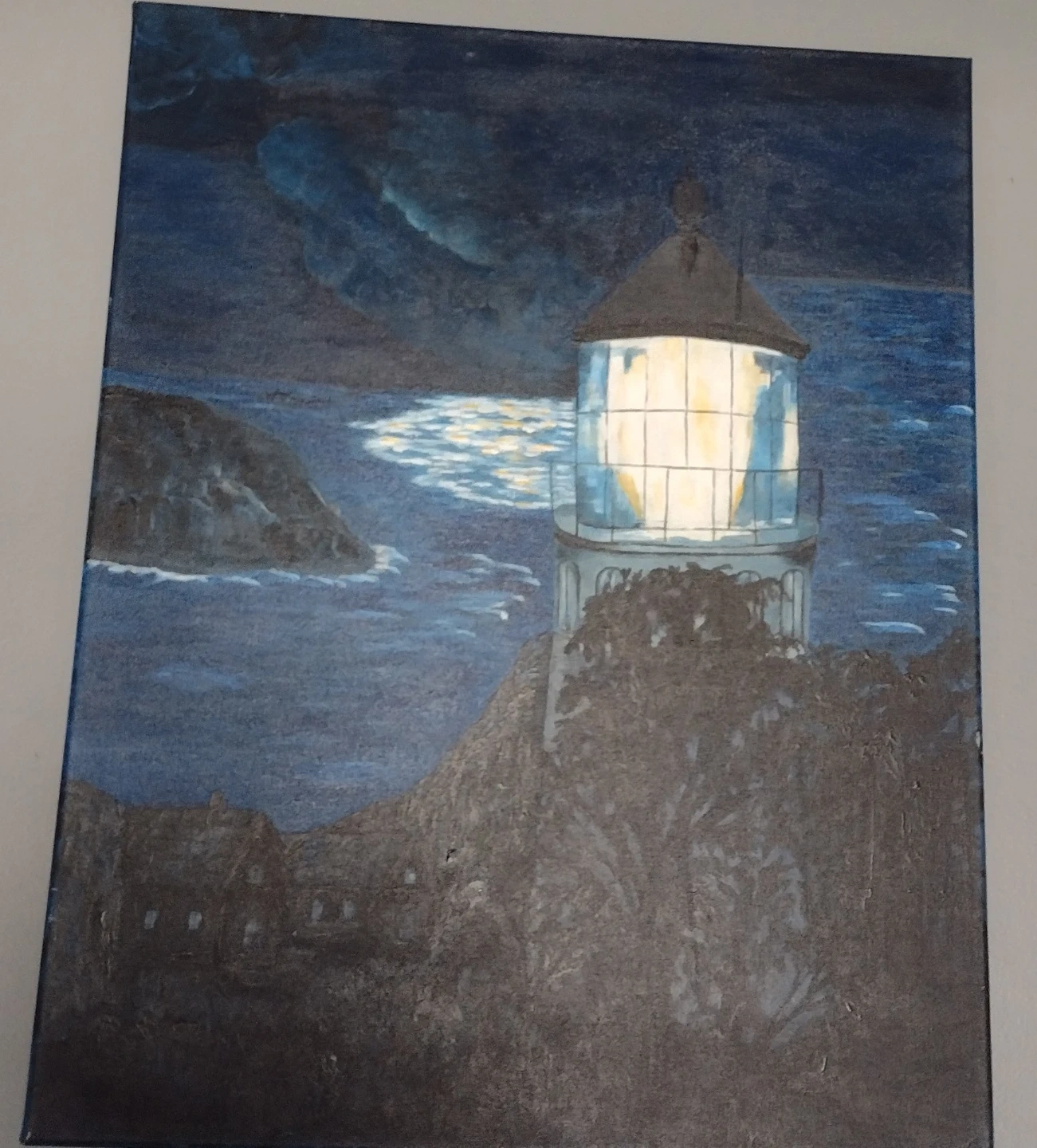 This is a painting depicting a lighthouse on a rocky shore with the light on. It shows the ocean and a cloudy night sky. The artwork has a moody, atmospheric feel.