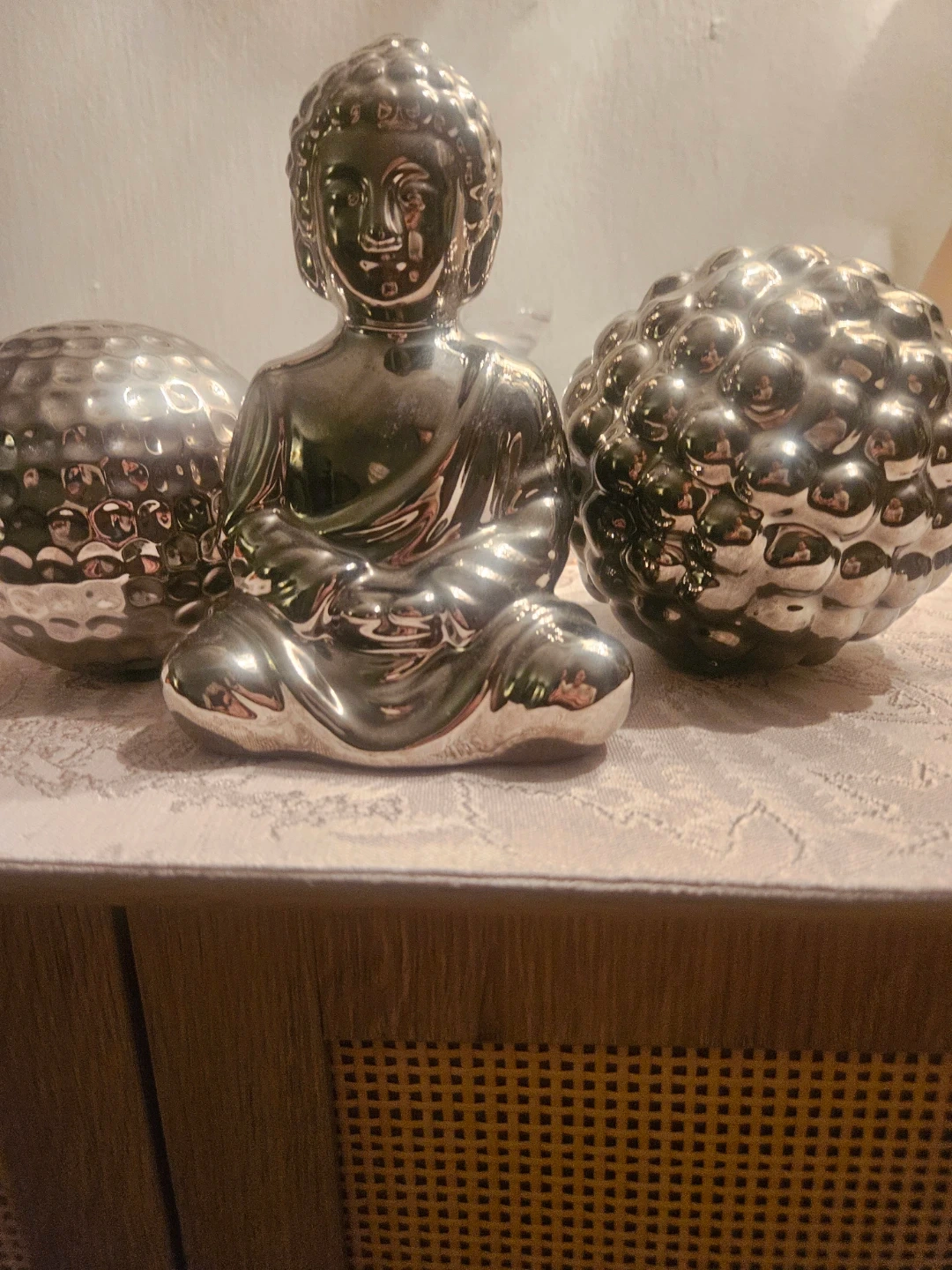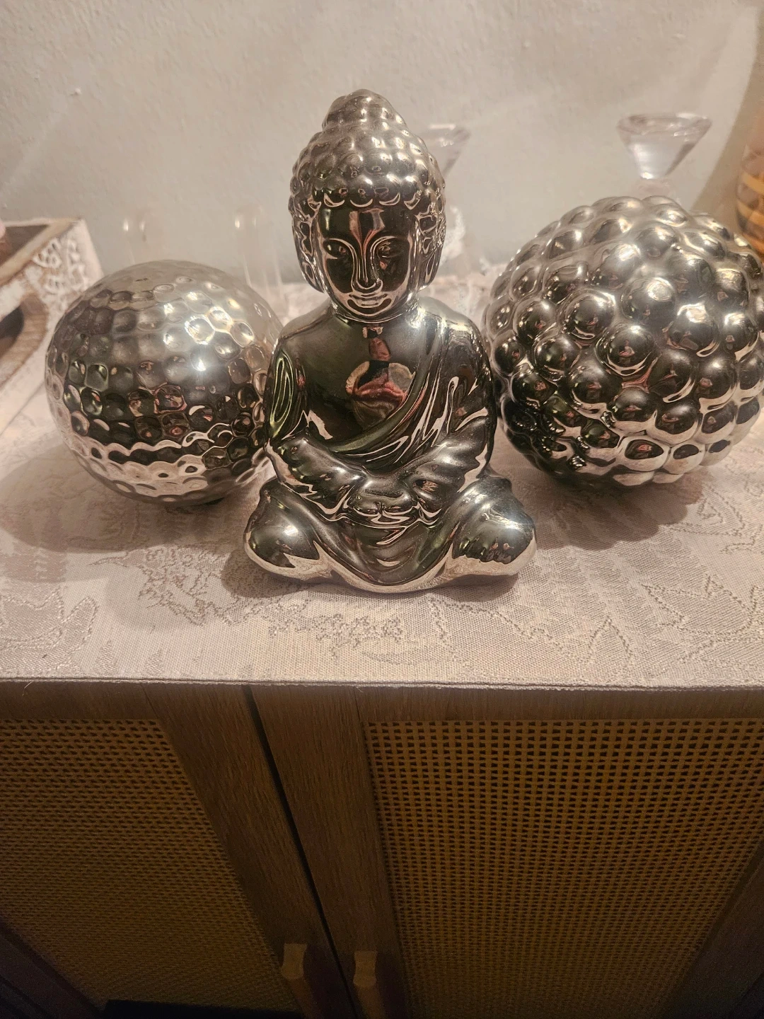 This set includes a silver-finished Buddha statue and two textured decorative spheres. It's a nice accent piece for any room.