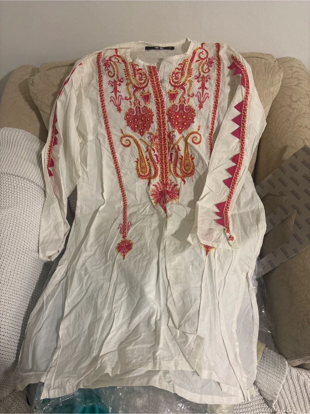 Selling a khaadi brand shirt white tunic with beautiful embroidery. It's in great condition and ready for a new home!