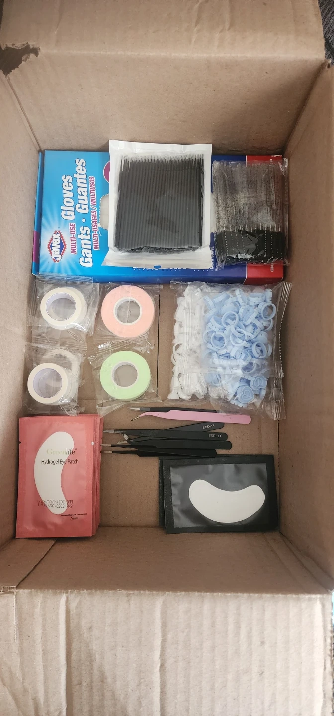 This lash extension kit includes assorted tools for application. It comes with gloves, microbrushes, lash tape, and hydrogel eye patches. Tweezers are also included for precise work.