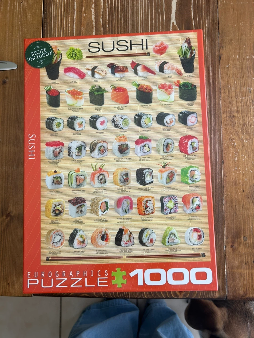 Eurographics puzzle featuring a colourful collage of various sushi types. Includes a recipe! Great for sushi lovers and puzzle enthusiasts alike.