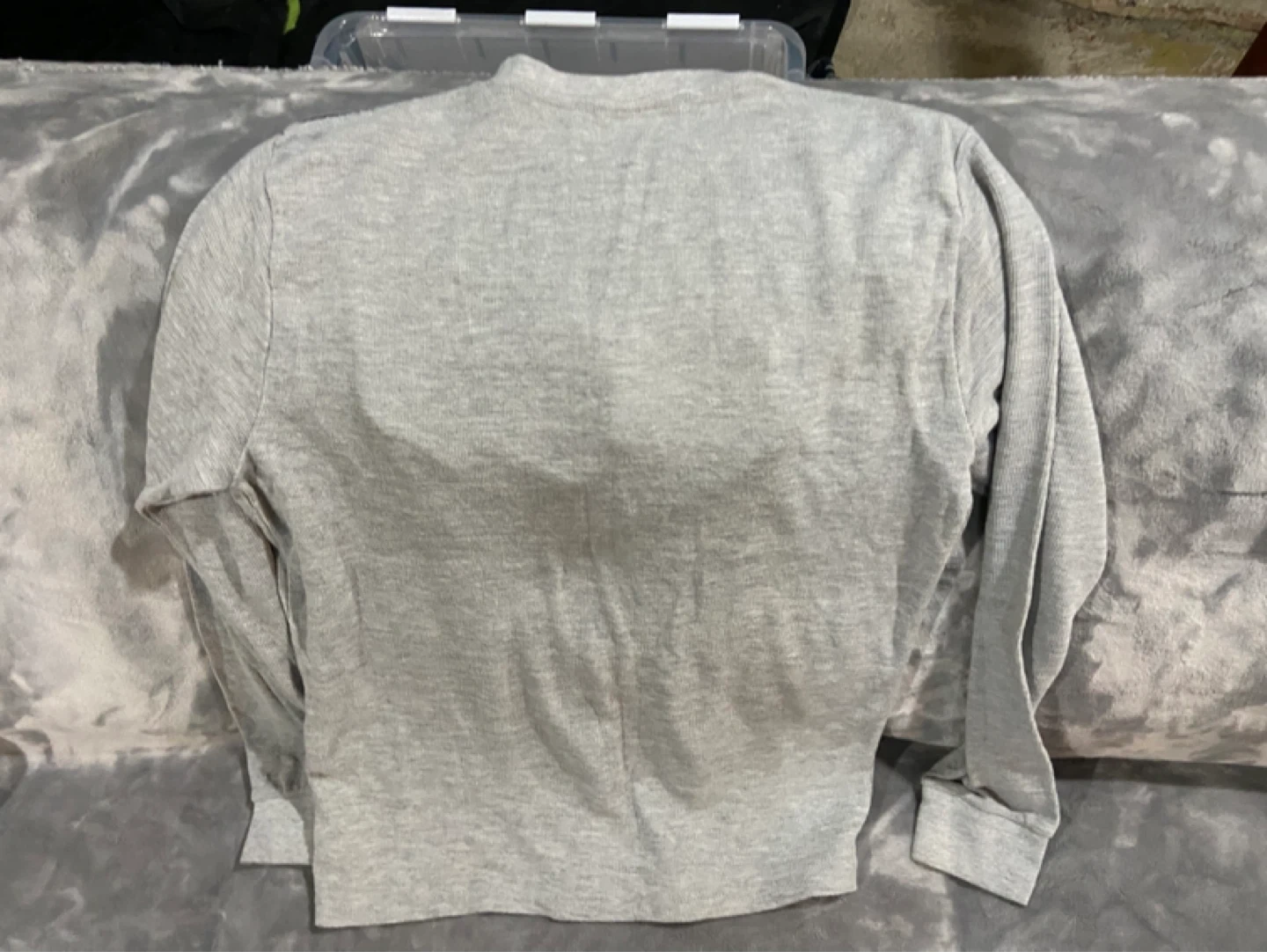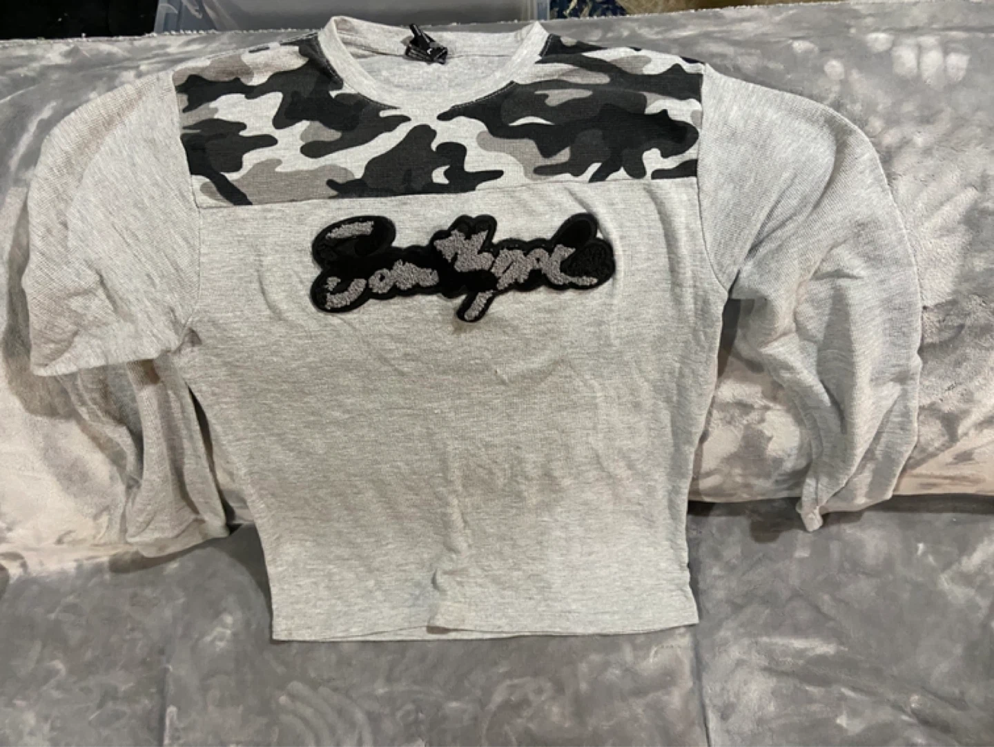 Grey long sleeve shirt with a camouflage panel across the chest. Features a black embroidered patch on the front. Made from a soft, breathable fabric. Size is L.