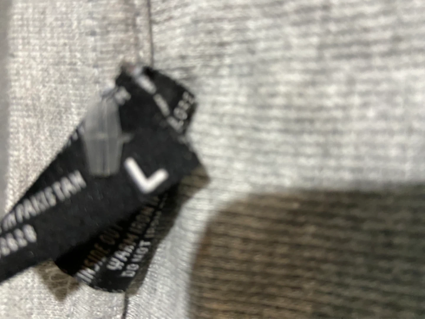 Grey long sleeve shirt with a camouflage panel across the chest. Features a black embroidered patch on the front. Made from a soft, breathable fabric. Size is L.