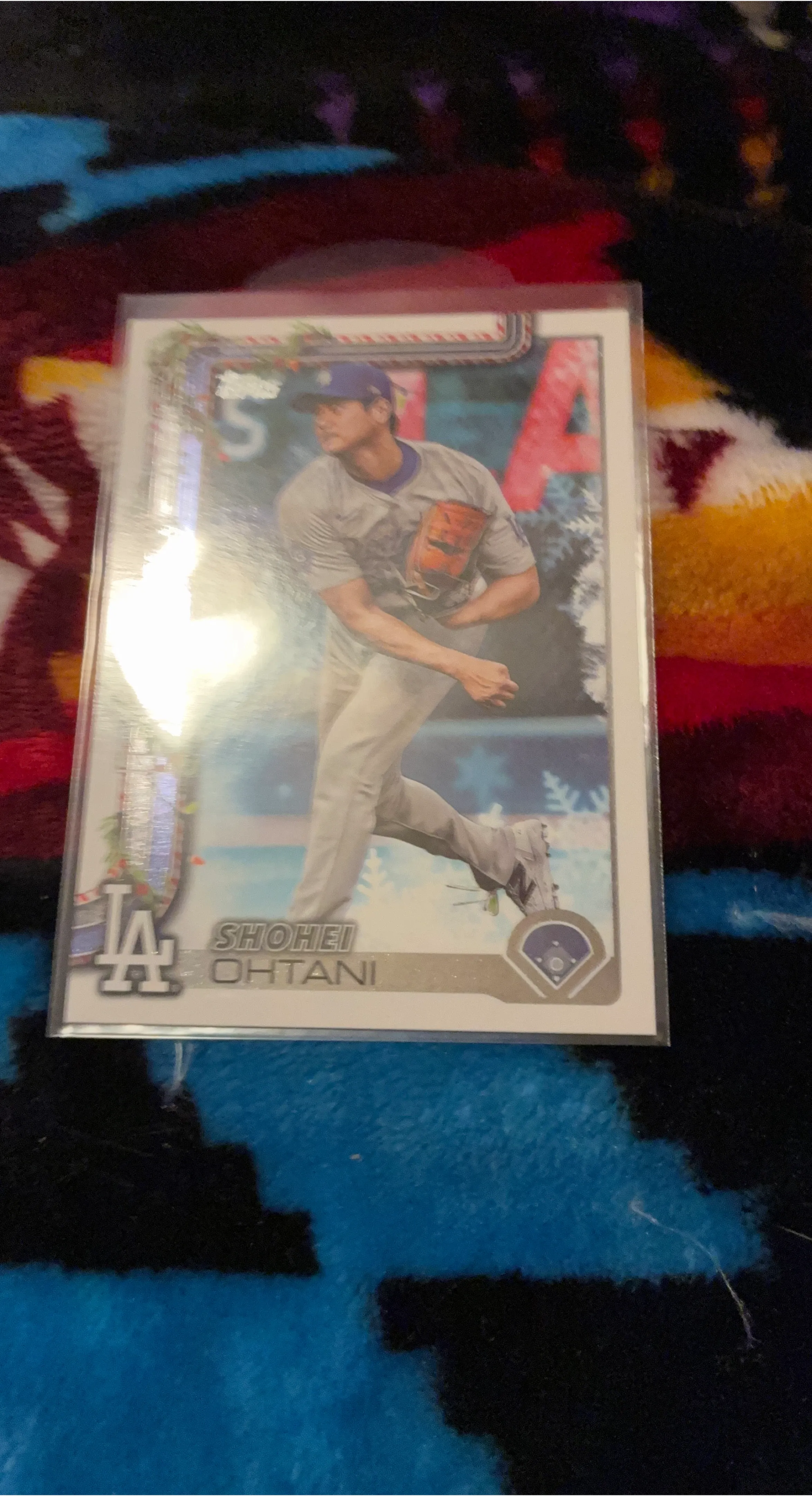 This is a Shohei Ohtani baseball card. It features him in his Los Angeles Dodgers uniform with a festive winter background. A great addition for any baseball fan!