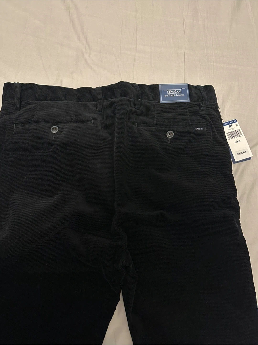 Authentic Polo by Ralph Lauren black corduroy pants. They're a size 34x32 with a slim fit. Corduroy material. Very classy.