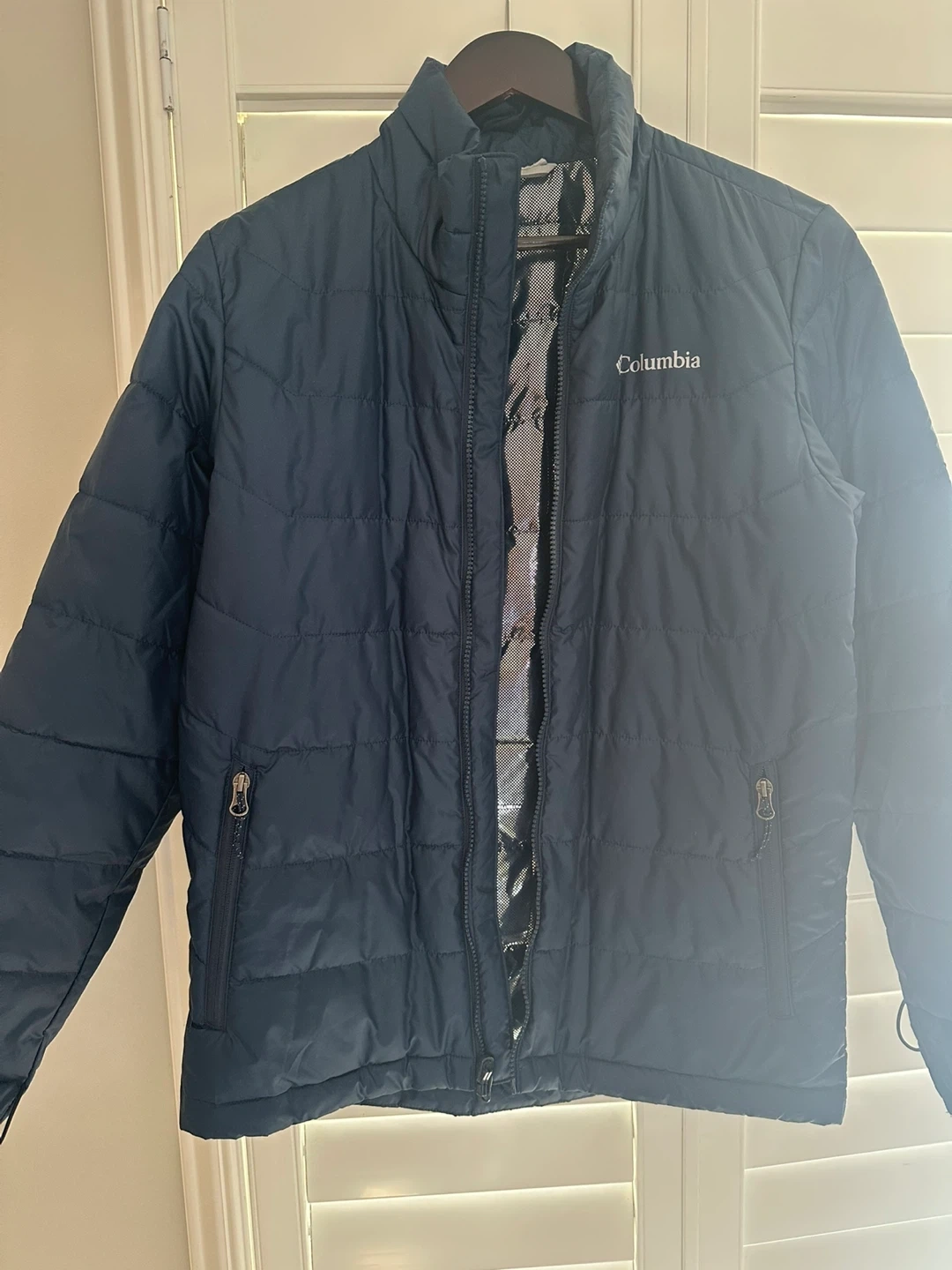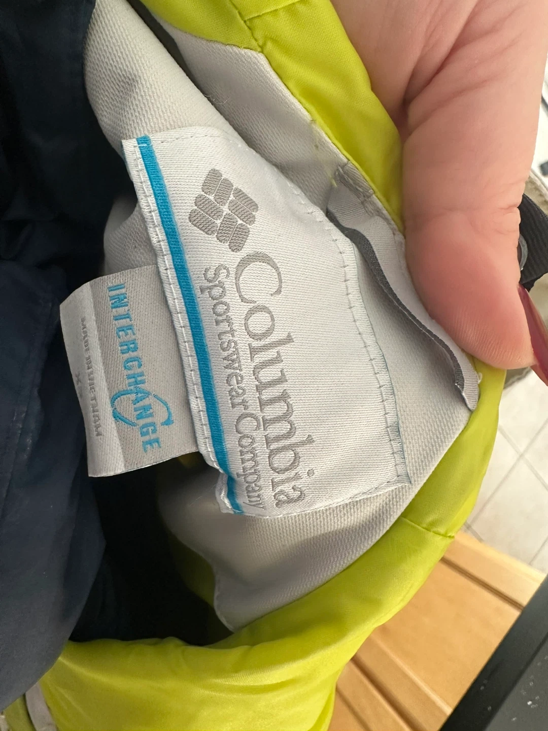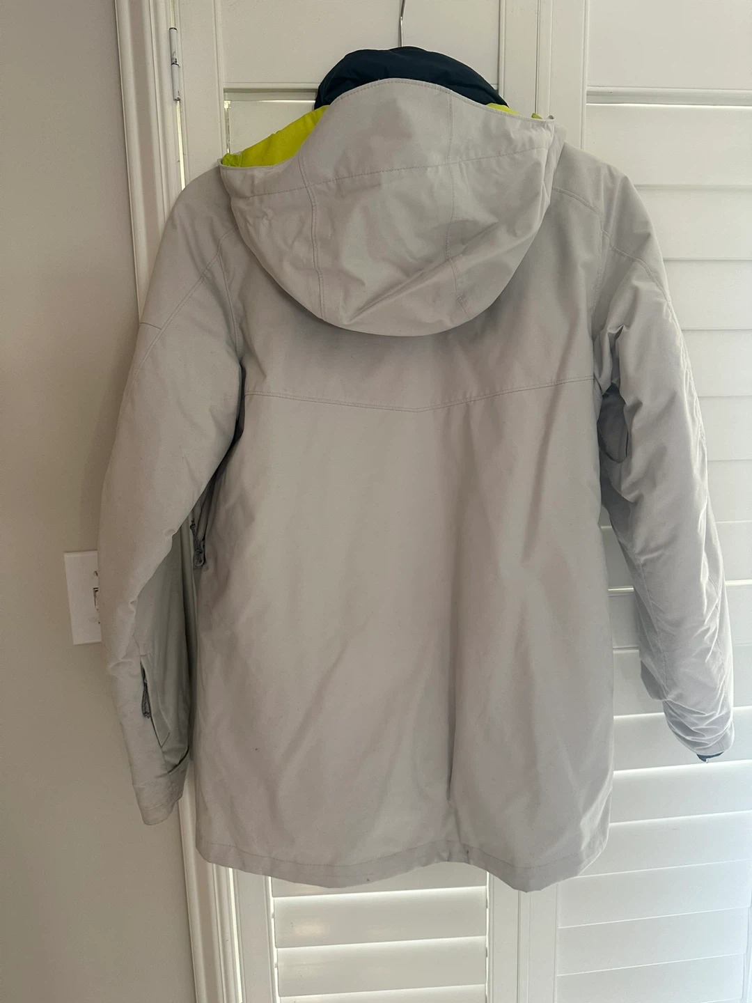 This is a Columbia Interchange 3-in-1 jacket in size XS. It's a versatile jacket system designed for varying weather conditions. The outer shell is a light grey, and it comes with a navy blue inner liner jacket. It's made of durable material for outdoor activities.