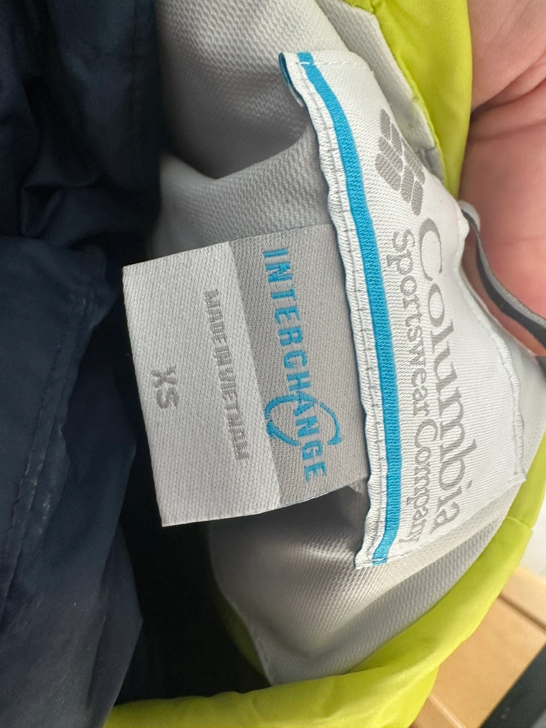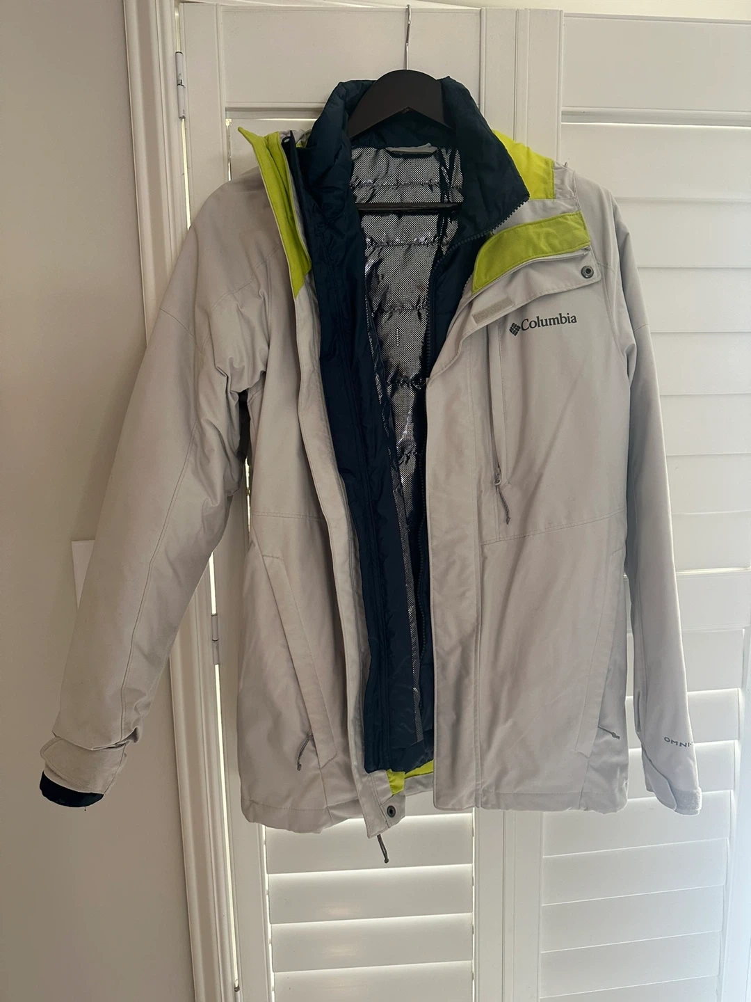 This is a Columbia Interchange 3-in-1 jacket in size XS. It's a versatile jacket system designed for varying weather conditions. The outer shell is a light grey, and it comes with a navy blue inner liner jacket. It's made of durable material for outdoor activities.