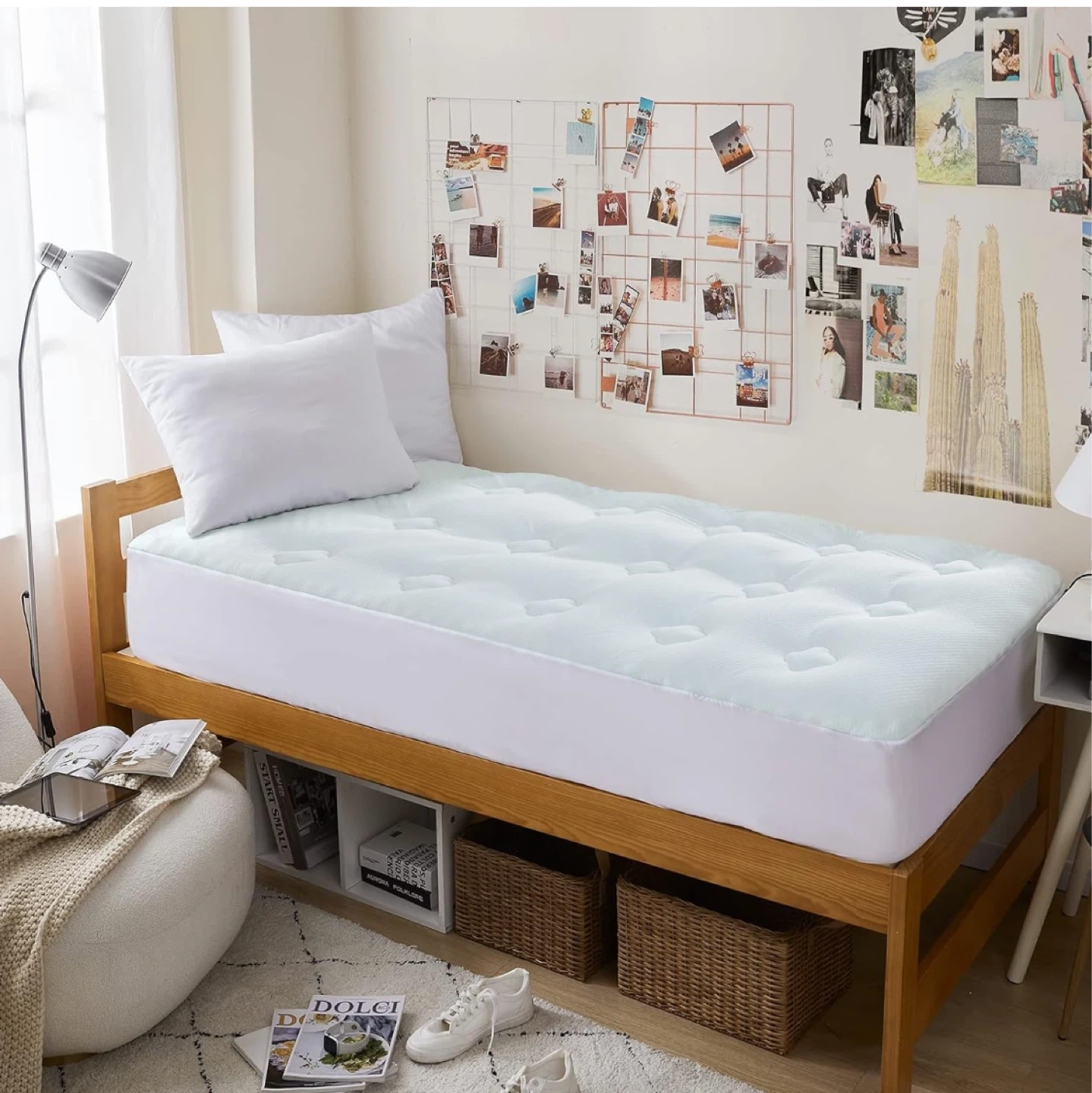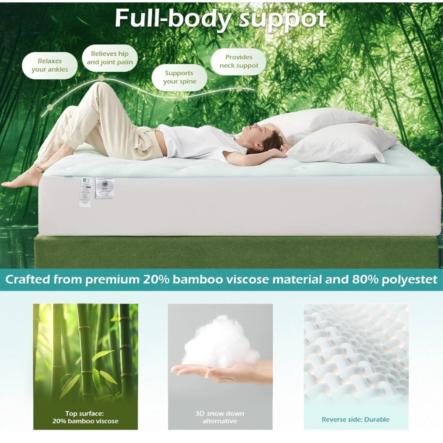 This mattress topper features a multi-layer design for comfort and support. It's crafted with 3D structured bamboo fibers that help regulate body temperature and a memory foam layer with cooling gel to align your spine and alleviate pressure points. It also includes down alternative fill for a fluffy feel and is made with 100% polyester. This topper provides full-body support for a more comfortable sleep.