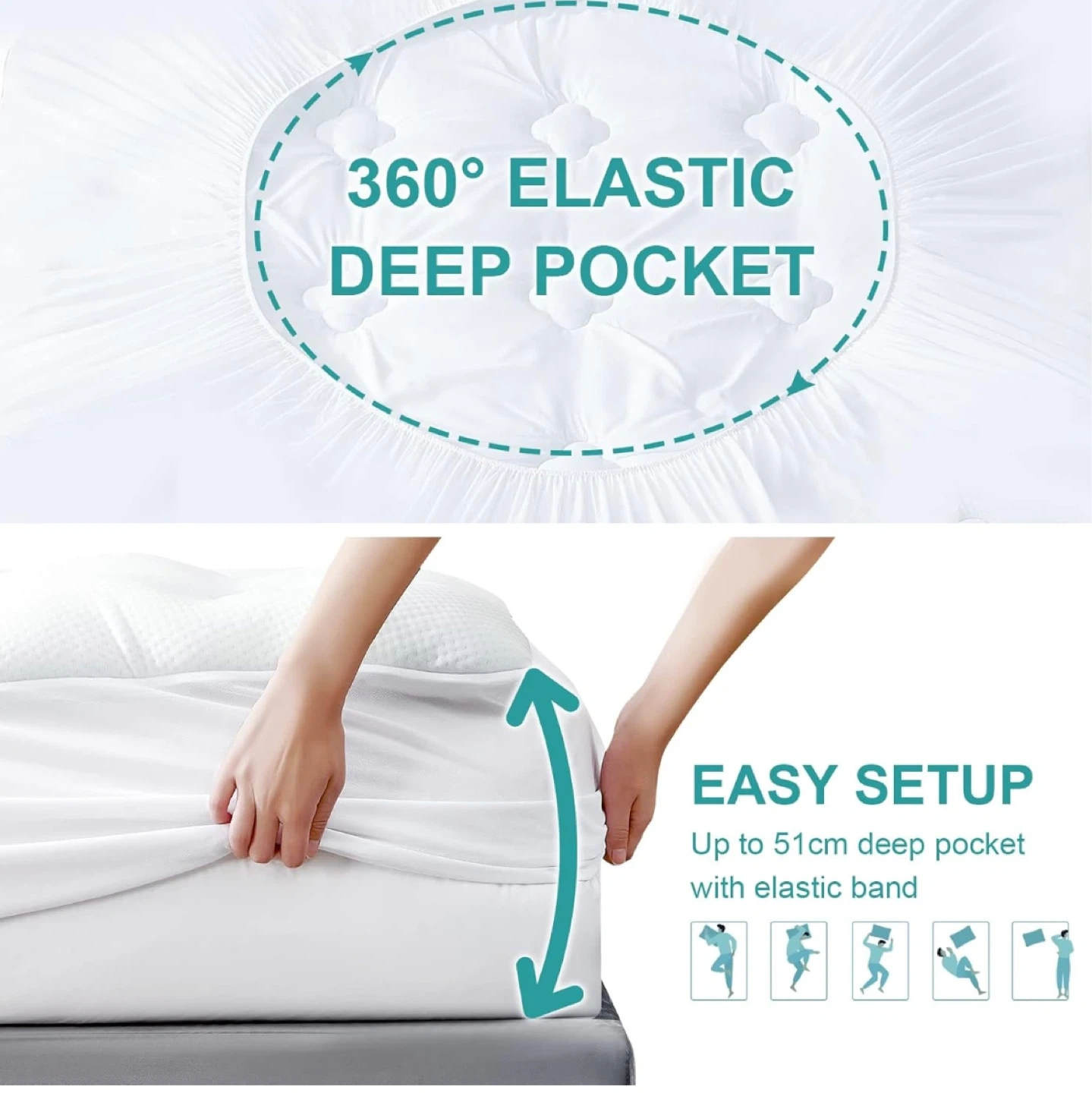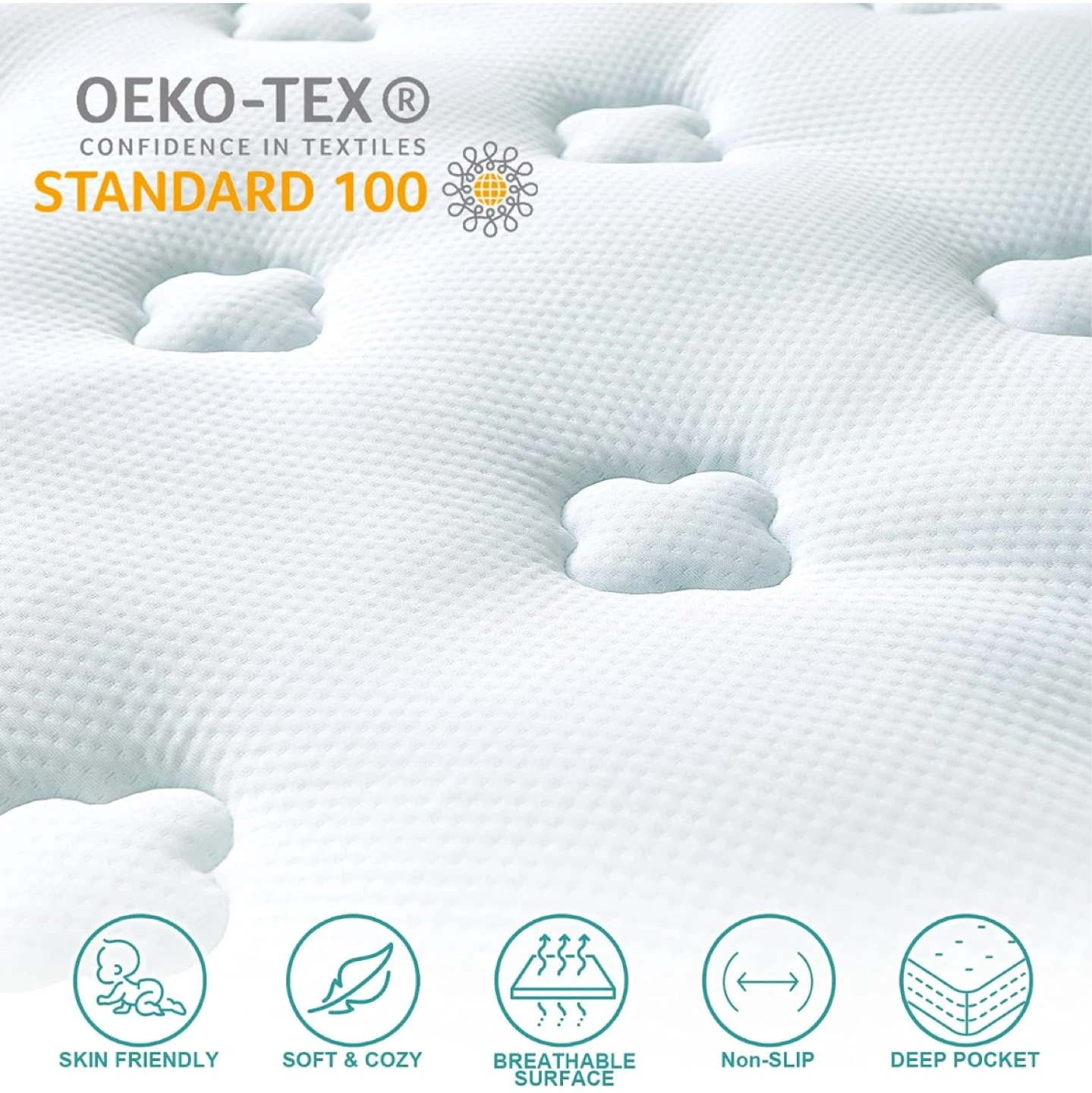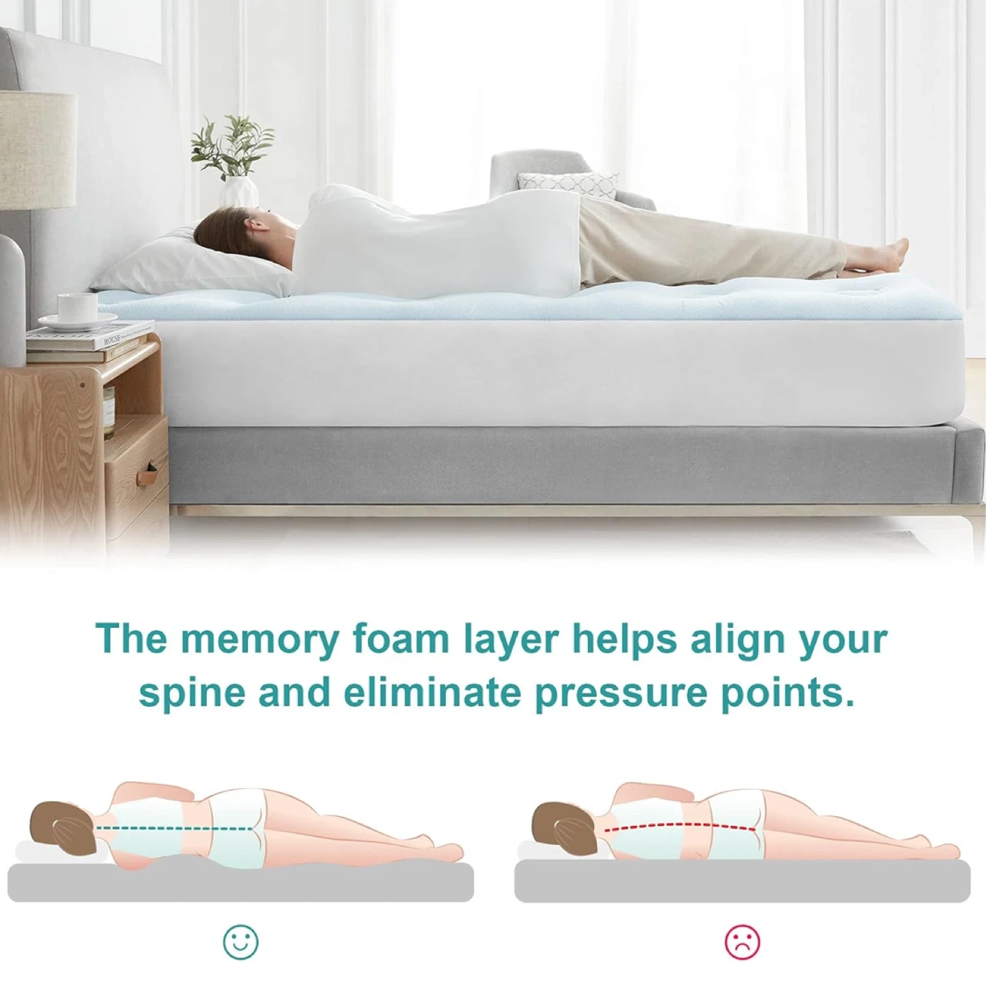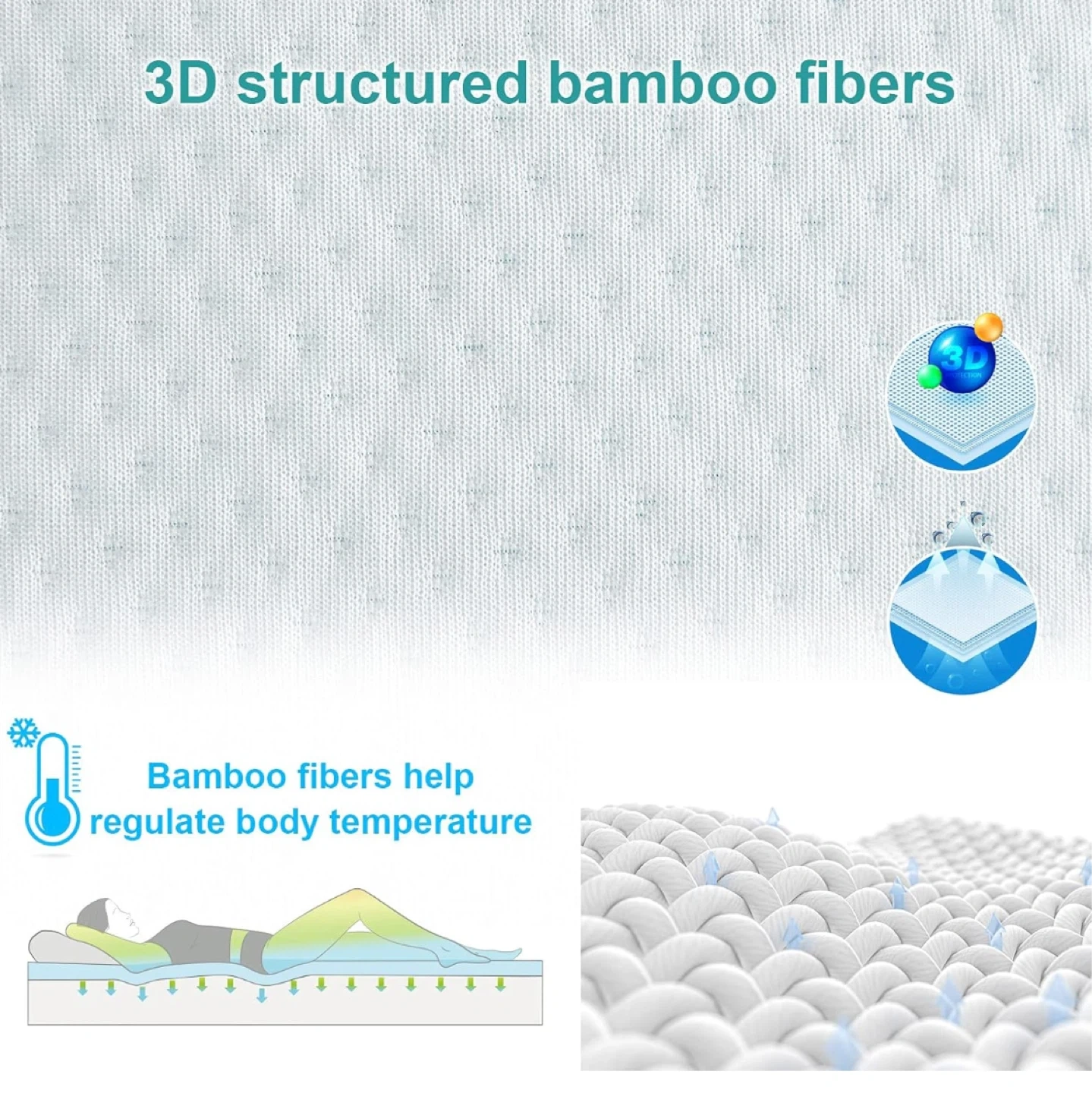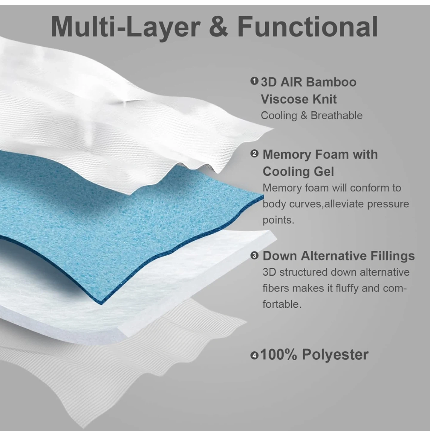 This mattress topper features a multi-layer design for comfort and support. It's crafted with 3D structured bamboo fibers that help regulate body temperature and a memory foam layer with cooling gel to align your spine and alleviate pressure points. It also includes down alternative fill for a fluffy feel and is made with 100% polyester. This topper provides full-body support for a more comfortable sleep.