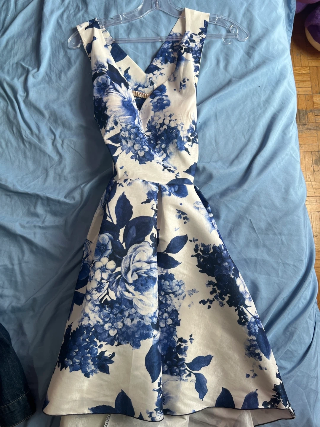 Beautiful white midi dress with a bold blue floral print. It features a flattering V-neckline and a flared skirt. This dress is perfect for a garden party or a summer wedding!