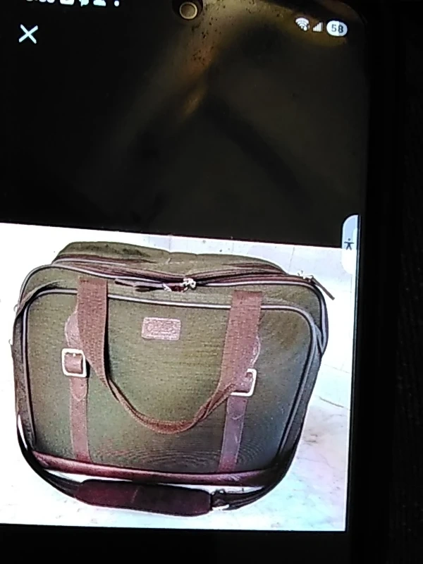 This is a green travel bag with brown leather accents and buckle closures. It features a spacious interior with straps for securing contents. It's perfect for weekend trips or carrying essentials.
