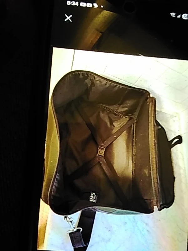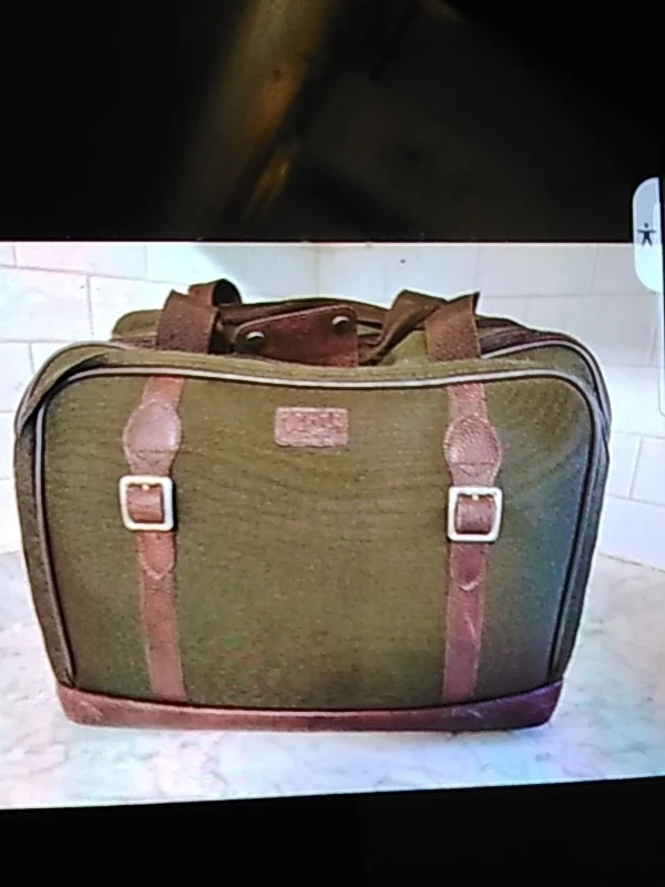 This is a green travel bag with brown leather accents and buckle closures. It features a spacious interior with straps for securing contents. It's perfect for weekend trips or carrying essentials.