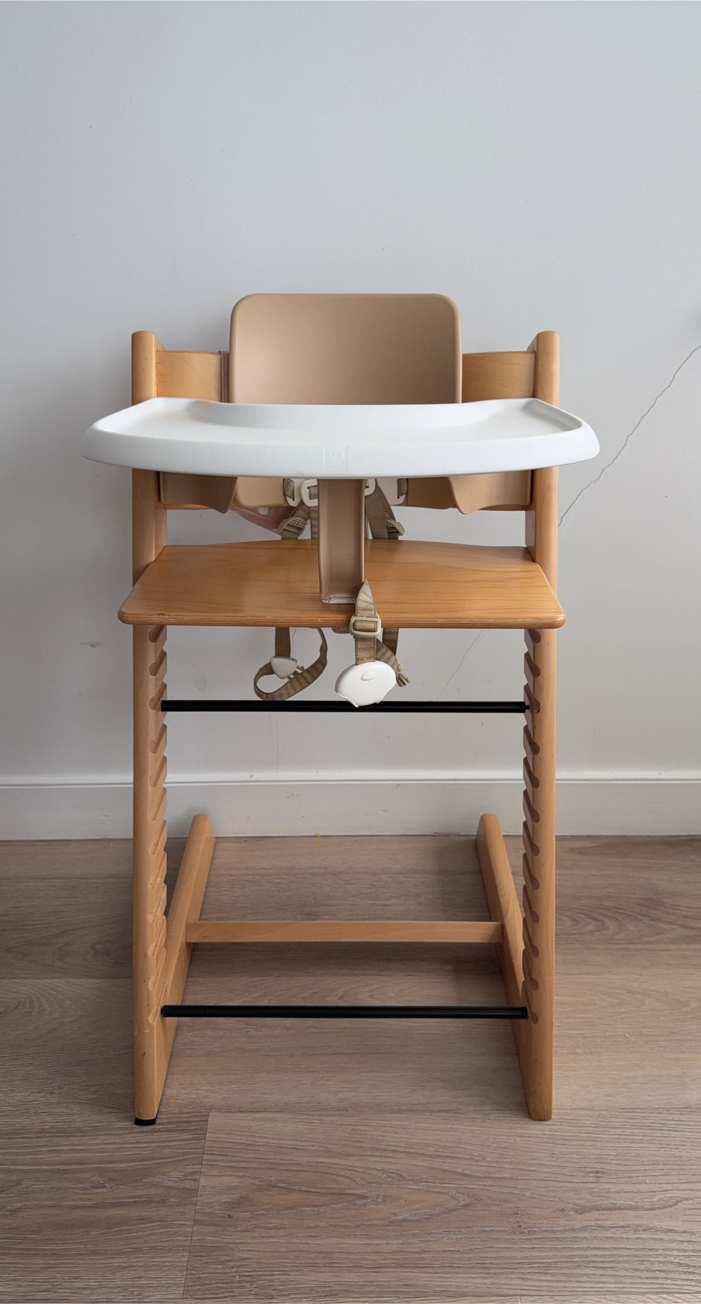 This is a Stokke Tripp Trapp high chair. It's made of natural wood with a beige seat and a white tray. The chair includes a safety harness for added security. It's adjustable to grow with your child!