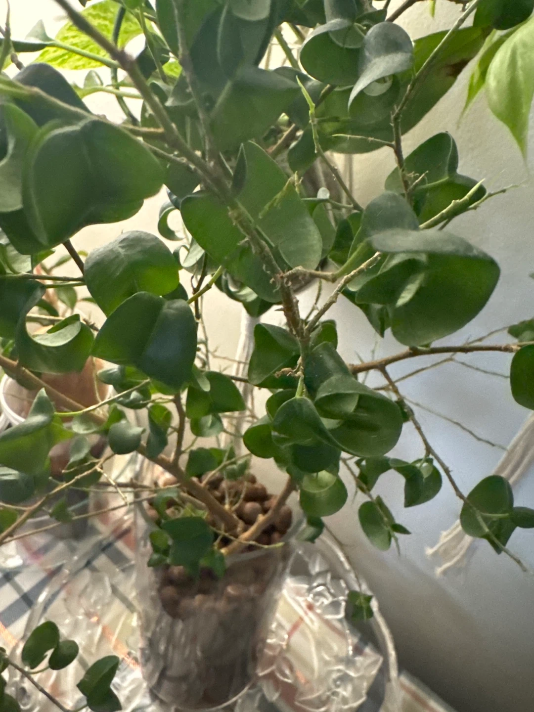 This is a healthy green houseplant in a clear pot with leca balls. It's well-established and ready to brighten your space. This plant would be great for someone looking to add some greenery to their home!