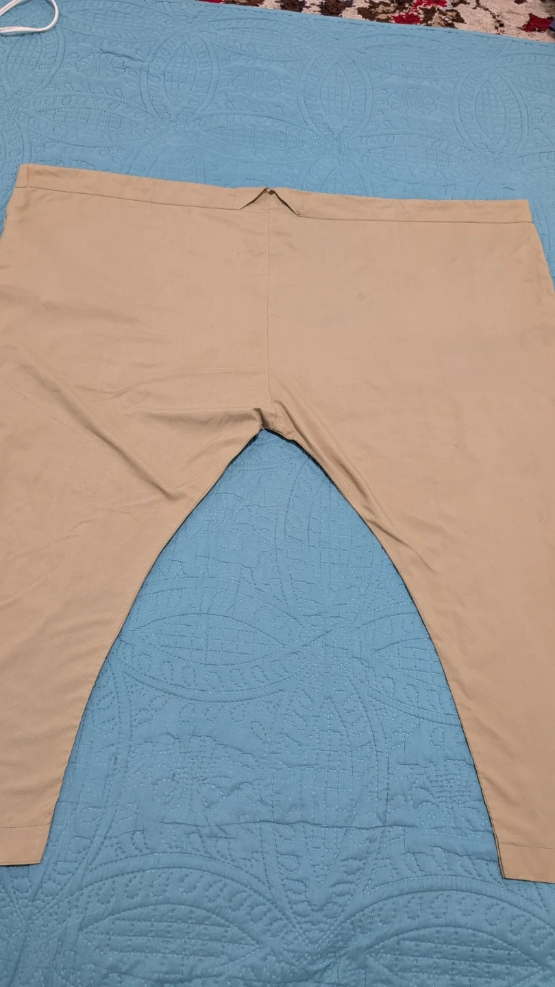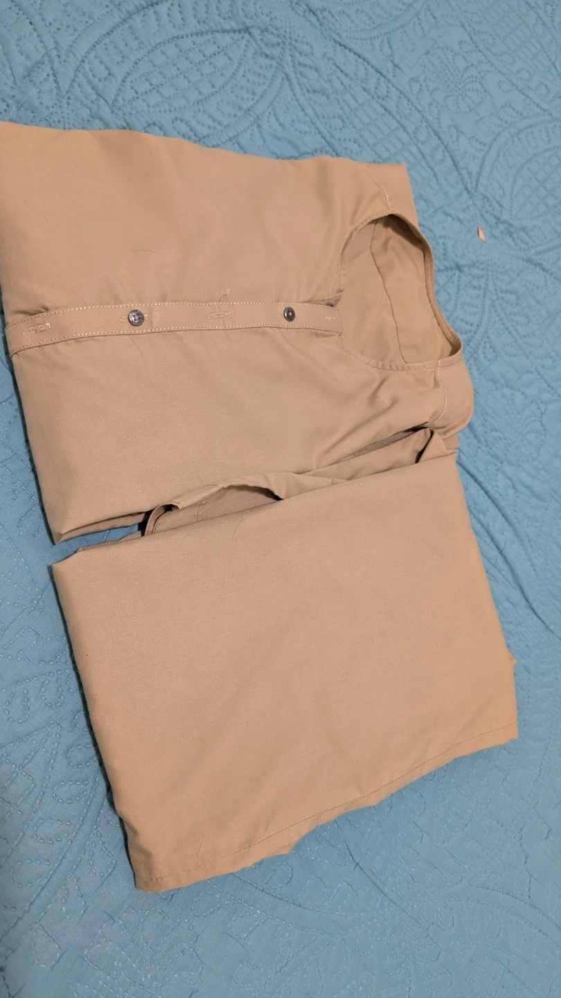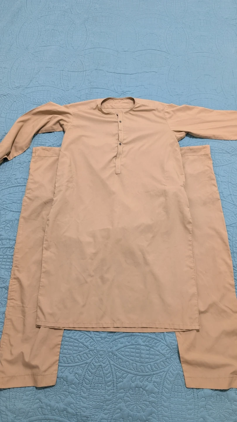 Selling a khaki-coloured Kurta Pajama set. The pants measure approximately 36 inches in length and 8 inches at the hem. It's in great condition and ready for a new home. One button is missing which can be seen.