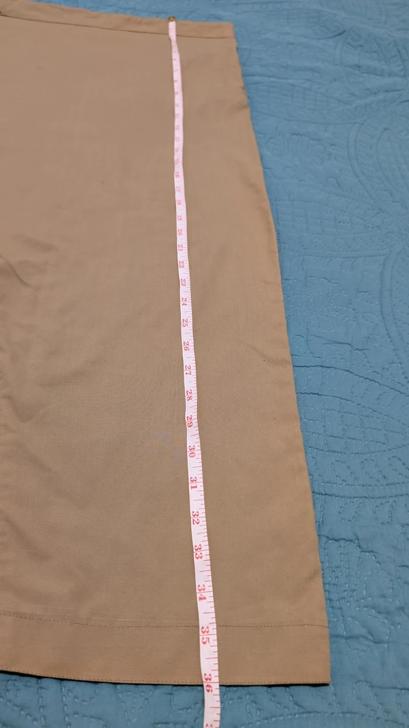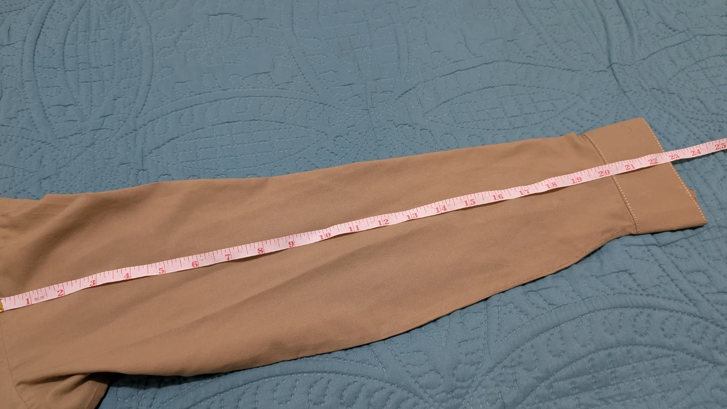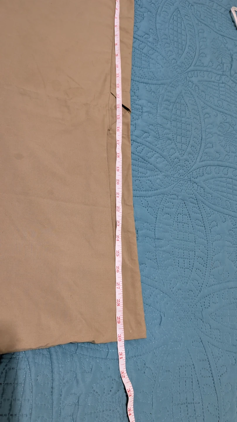 Selling a khaki-coloured Kurta Pajama set. The pants measure approximately 36 inches in length and 8 inches at the hem. It's in great condition and ready for a new home. One button is missing which can be seen.