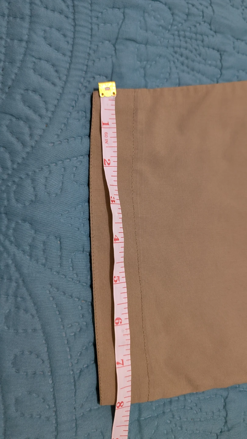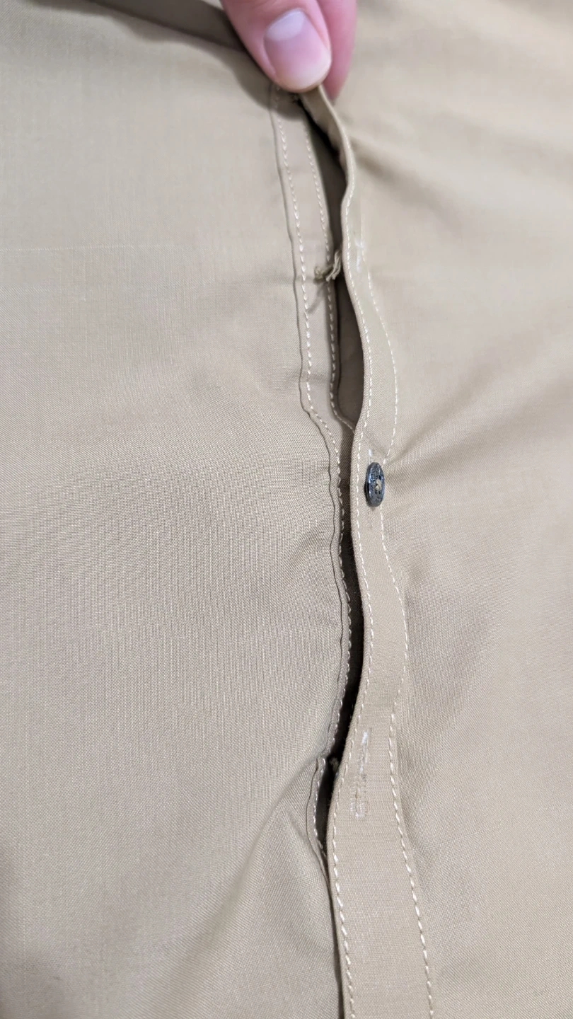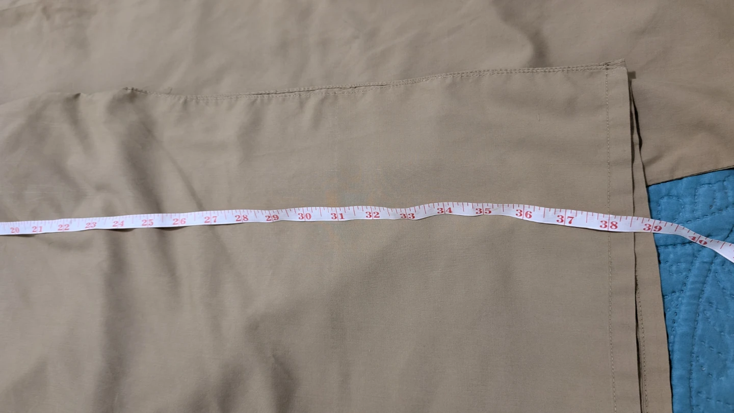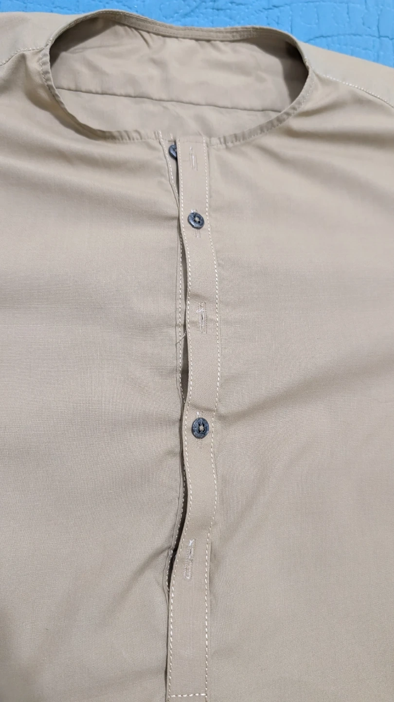Selling a khaki-coloured Kurta Pajama set. The pants measure approximately 36 inches in length and 8 inches at the hem. It's in great condition and ready for a new home. One button is missing which can be seen.