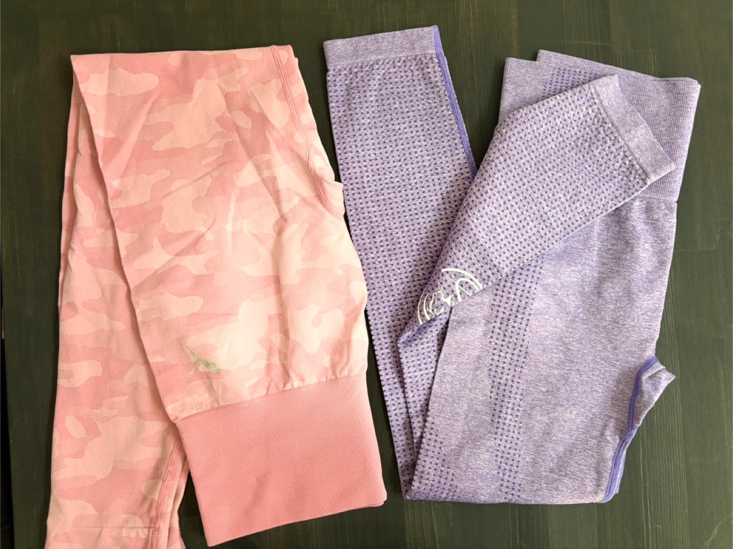 Two pairs of seamless leggings. One in pink camouflage print and the other in solid purple. Pink is Puma and size large and purple one is size medium with both being a high-waisted fit. They're made from a stretchy, breathable fabric perfect for workouts.