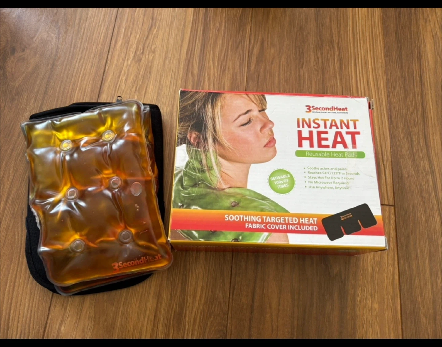 Selling a set of 3SecondHeat instant reusable heat pads! These pads soothe aches and pains and stay hot for up to 2 hours. and you can use them anywhere. A soothing targeted heat fabric cover is included