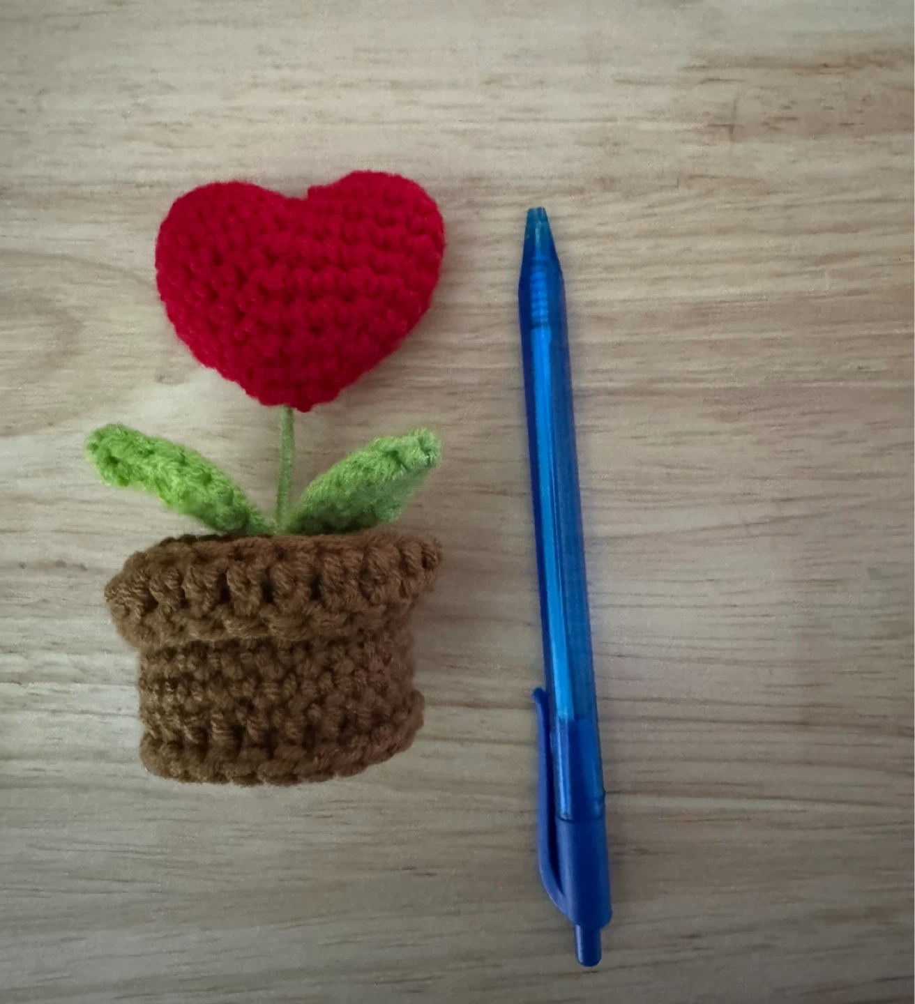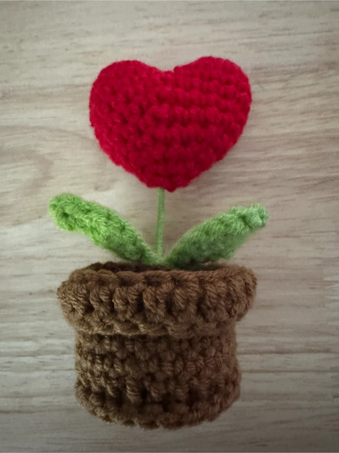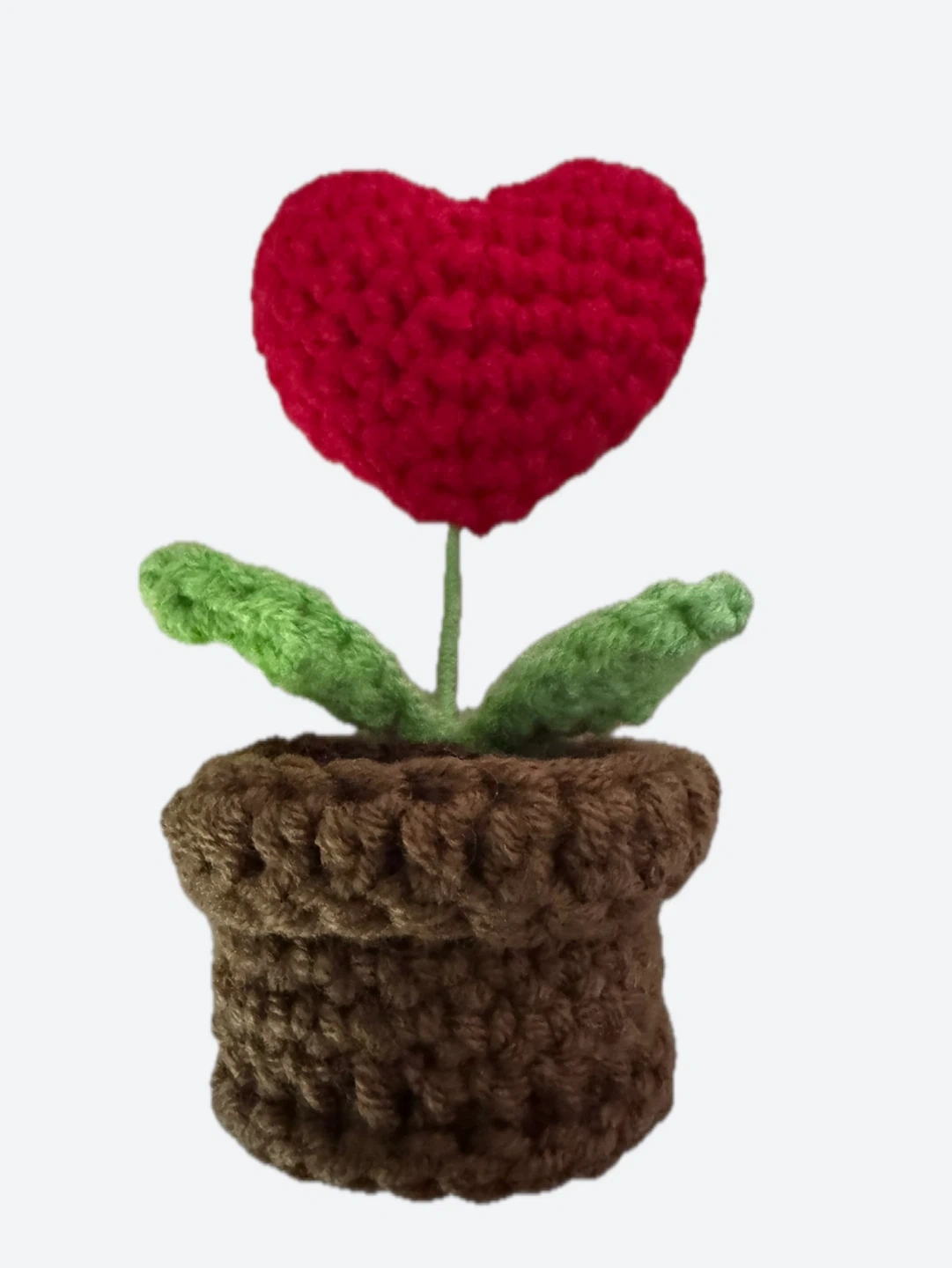 A cute crocheted decoration featuring a red heart flower in a brown pot with green leaves.