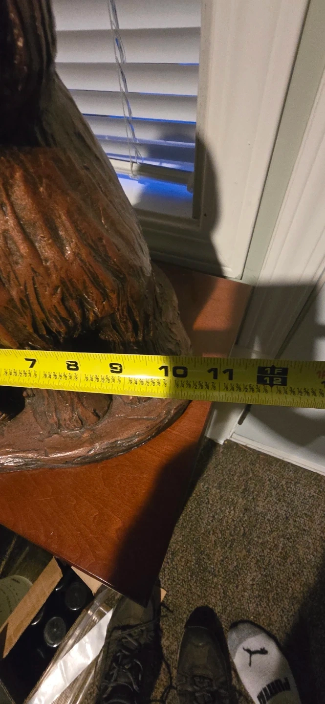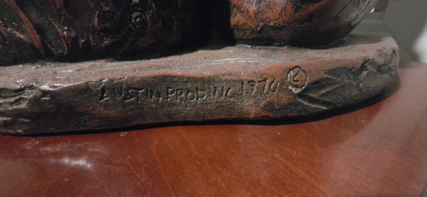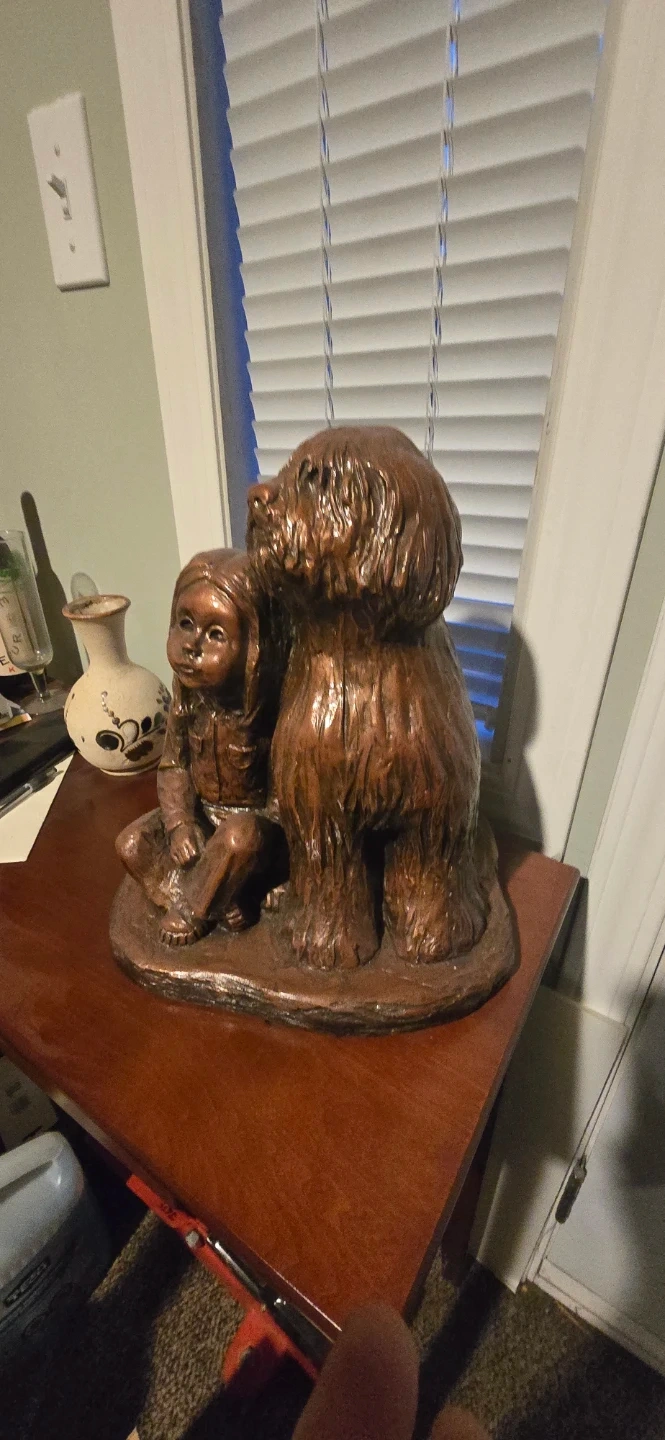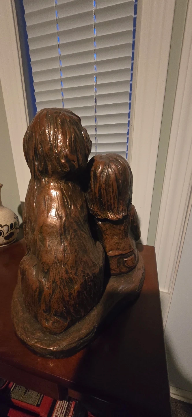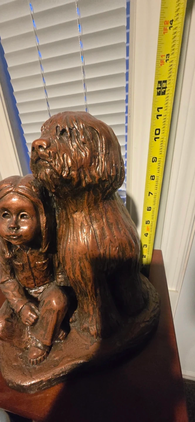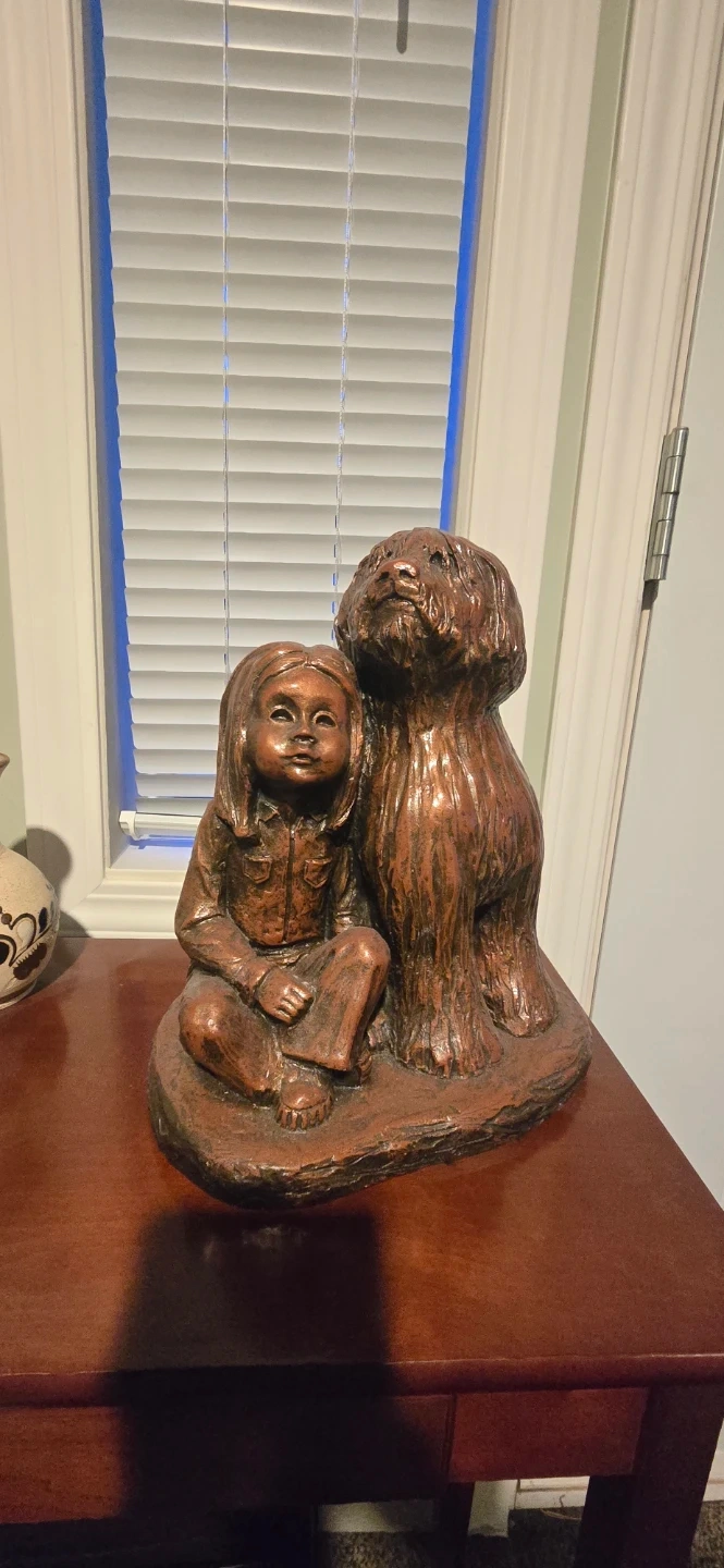 This charming statue depicts a young girl sitting with her dog. It has a detailed, bronze-like finish. It's approximately 13 inches tall. Its ceramic from 1976