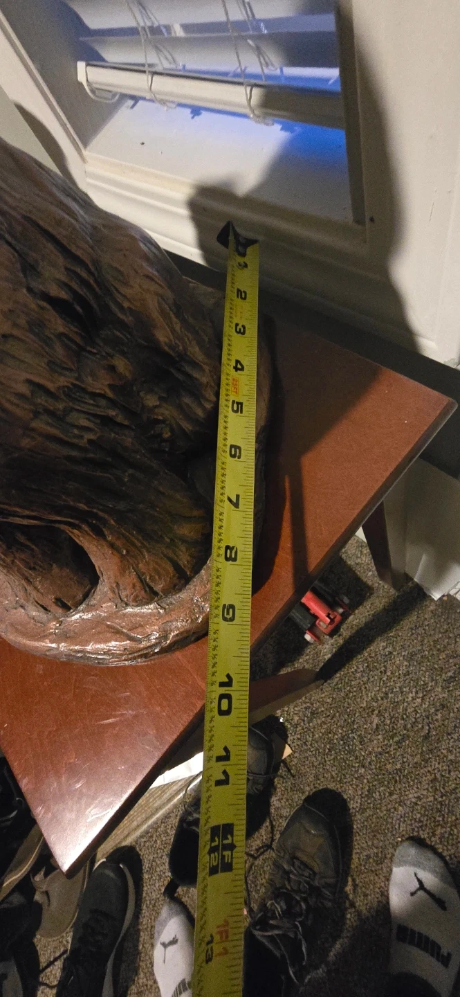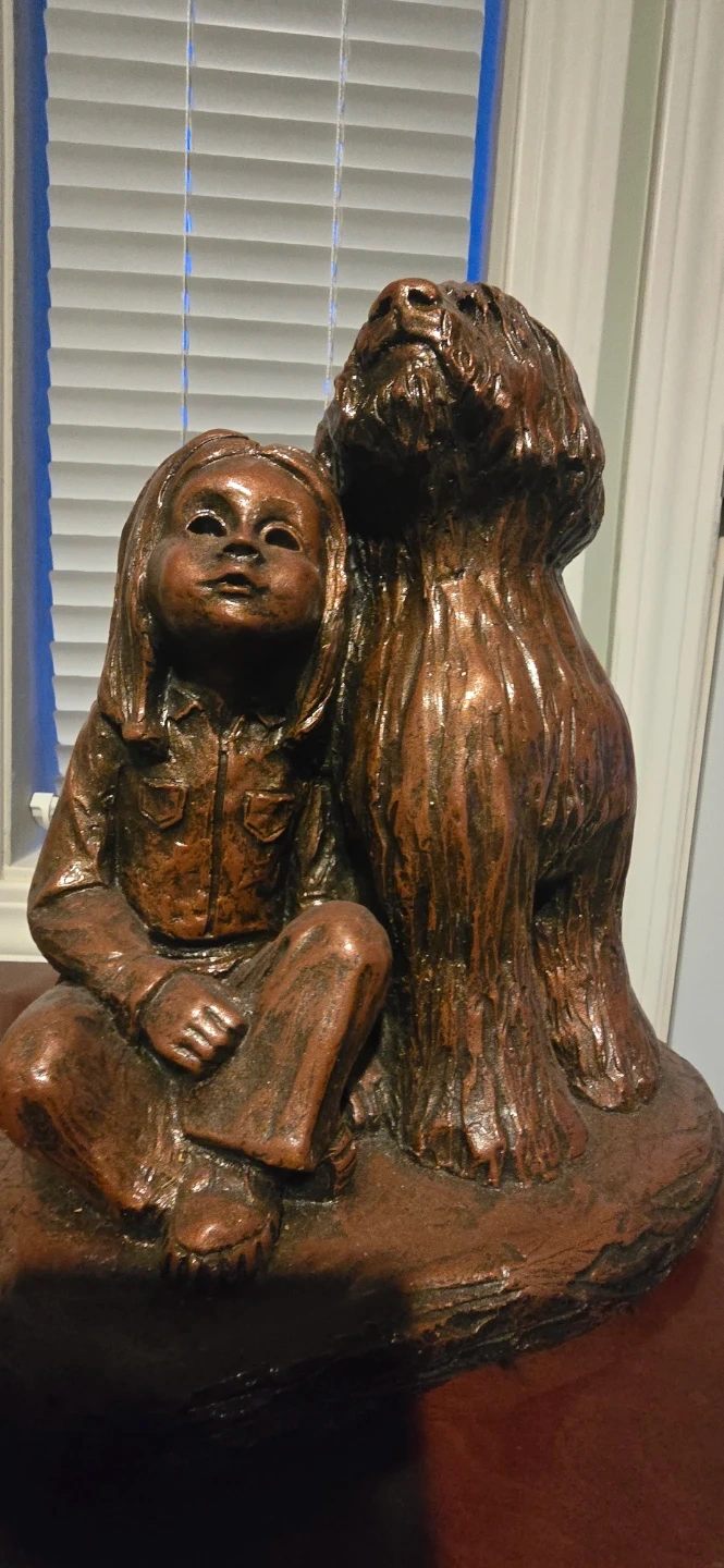 This charming statue depicts a young girl sitting with her dog. It has a detailed, bronze-like finish. It's approximately 13 inches tall. Its ceramic from 1976
