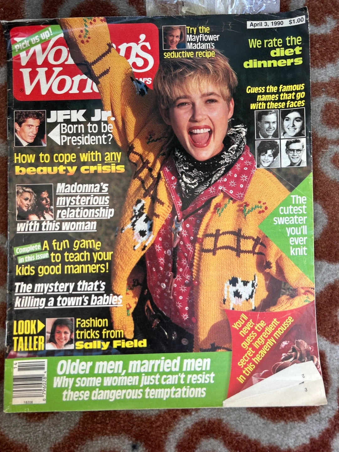 Stories on relationship advice and a recipe from the "Mayflower Madam." This issue of Women's World Magazine is dated April 3, 1990. It features articles on JFK Jr., Madonna's relationship, beauty crises, and diet dinners. Also includes fashion tricks from Sally Field.