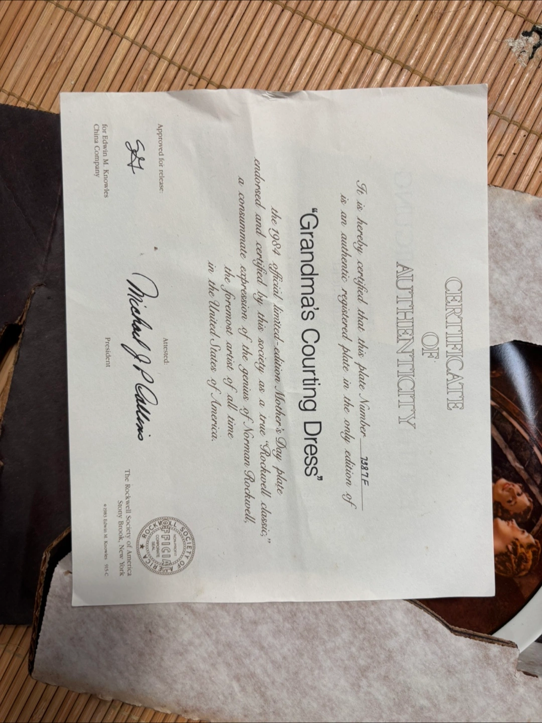Selling an Edwin M. Knowles limited edition Mother's Day plate, "Grandma's Courting Dress"! This plate is certified as an authentic registered plate. It comes with its original box and a certificate of authenticity Pickup near Hawkesbury Can deliver for a fee