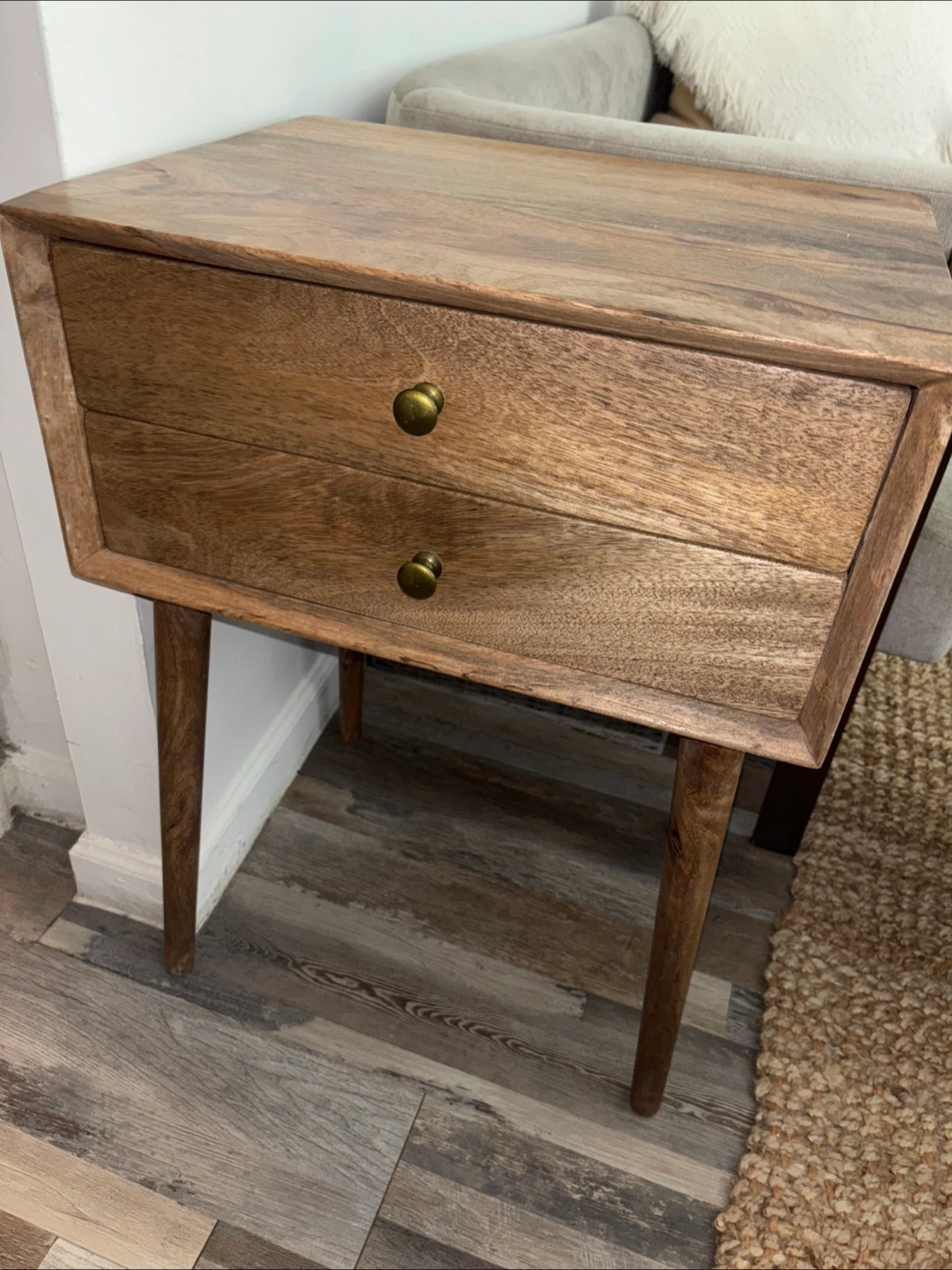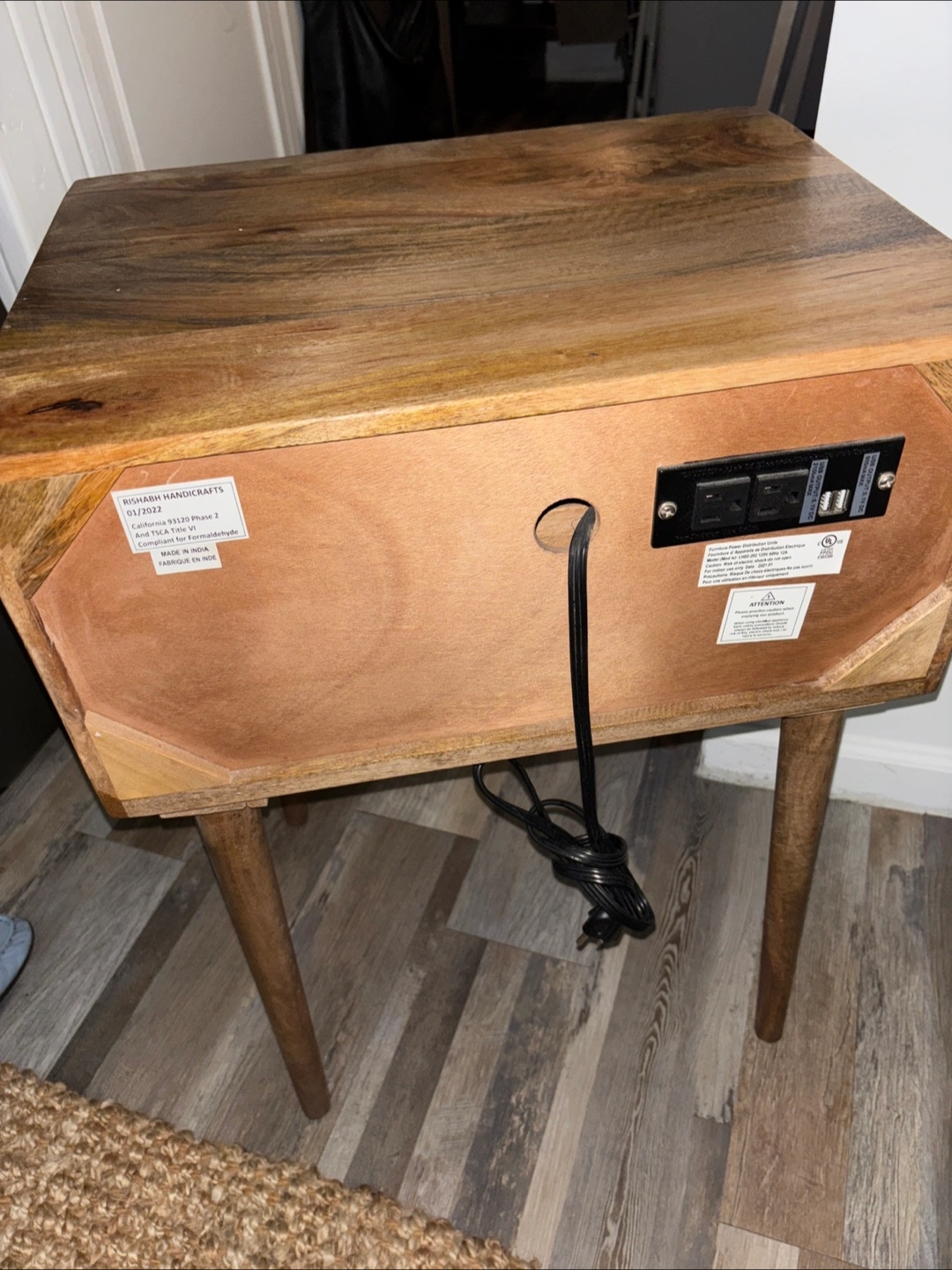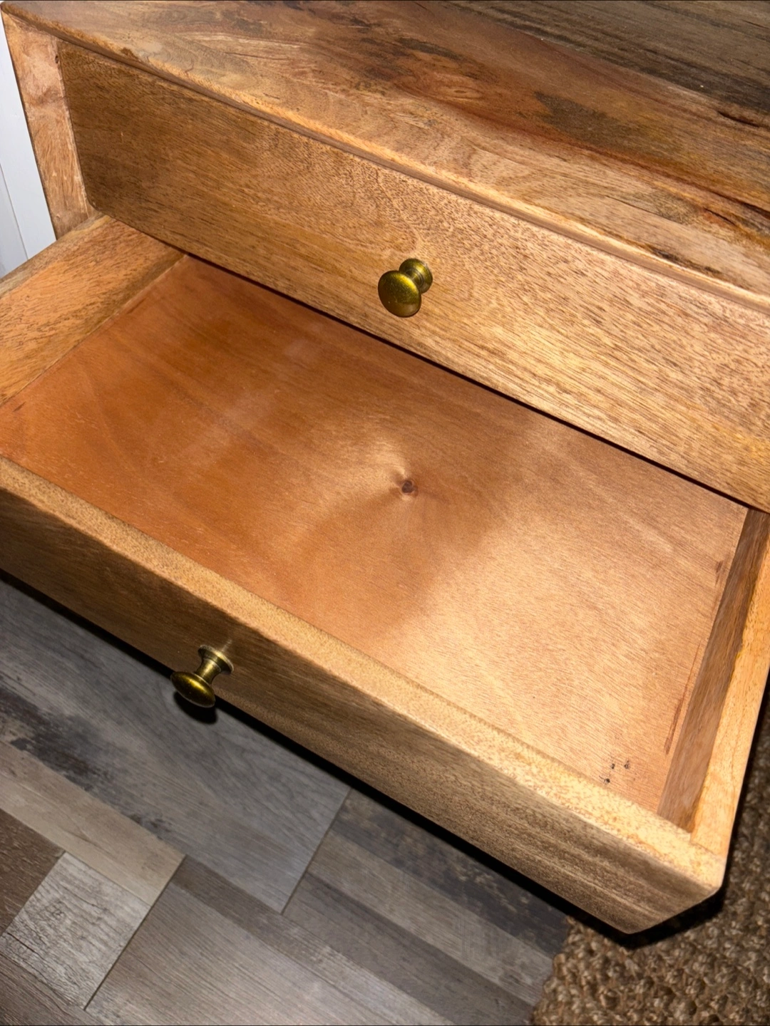Set of 2 matching Rishabh Handicrafts nightstands. Real wood and features two drawers with brass colored handles with electrical built-in USB ports, power outlets, which is super convenient. (manufacturing date is January 2022) Made in India. Excellent shape, like new!