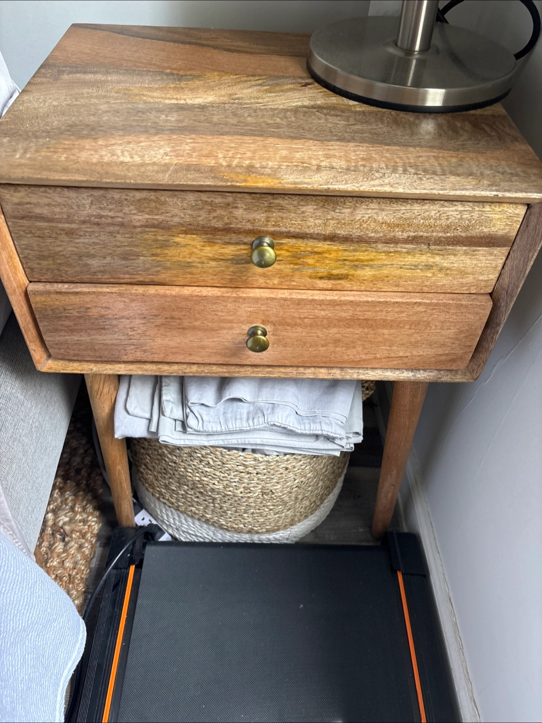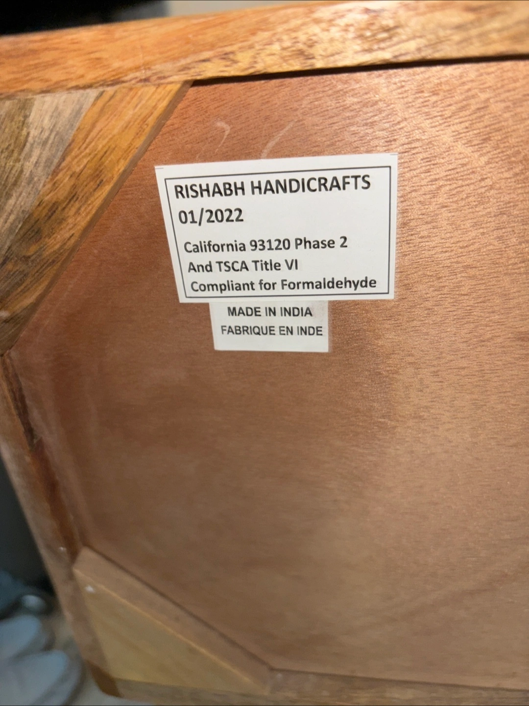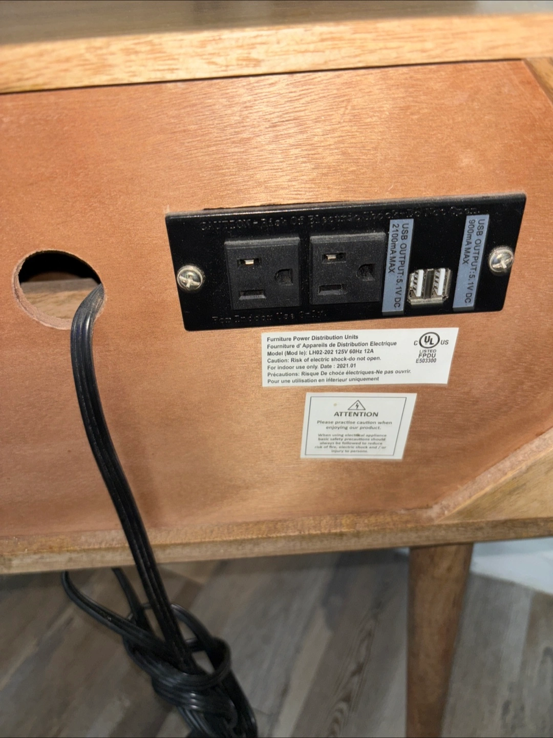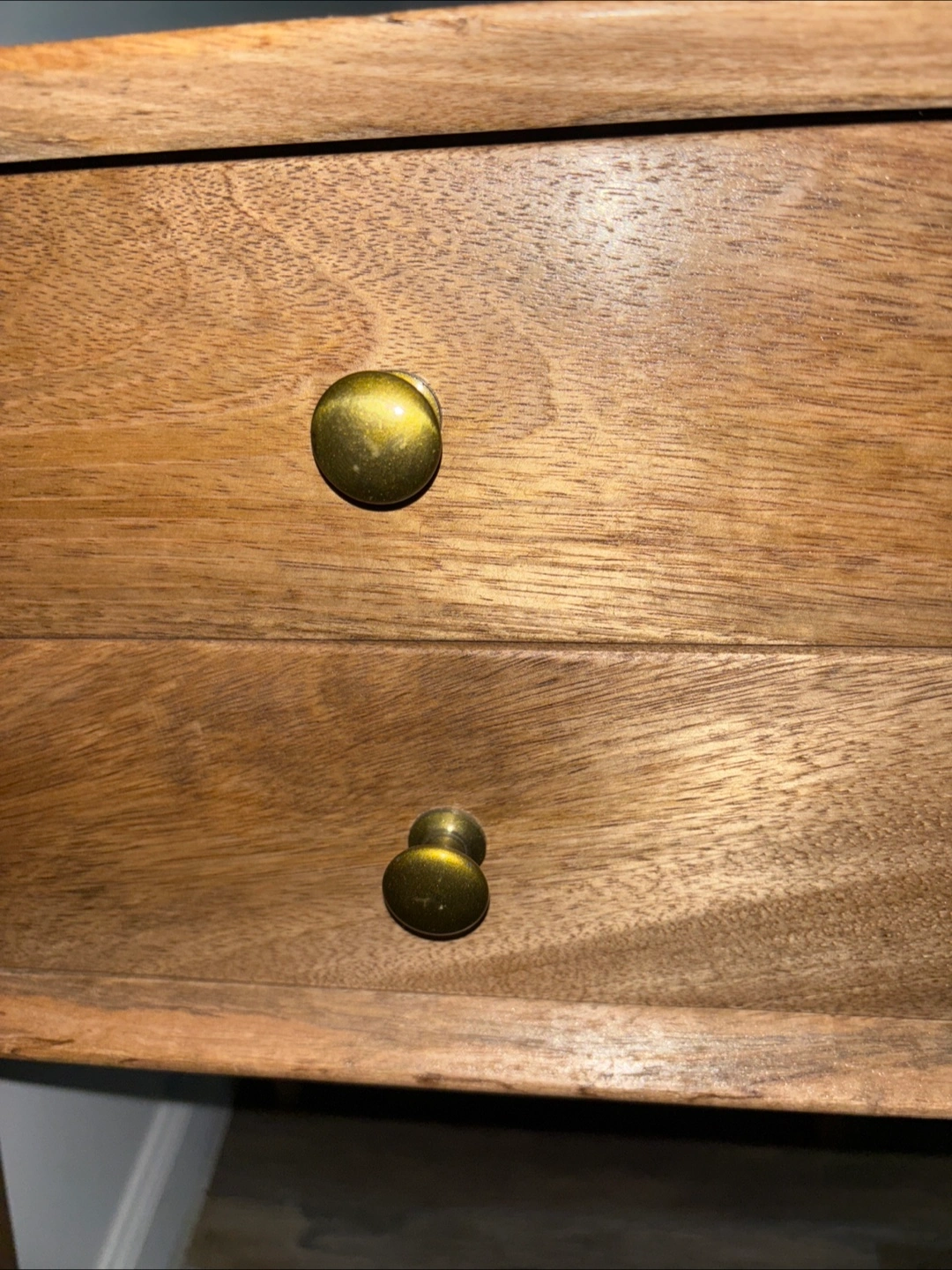 Set of 2 matching Rishabh Handicrafts nightstands. Real wood and features two drawers with brass colored handles with electrical built-in USB ports, power outlets, which is super convenient. (manufacturing date is January 2022) Made in India. Excellent shape, like new!