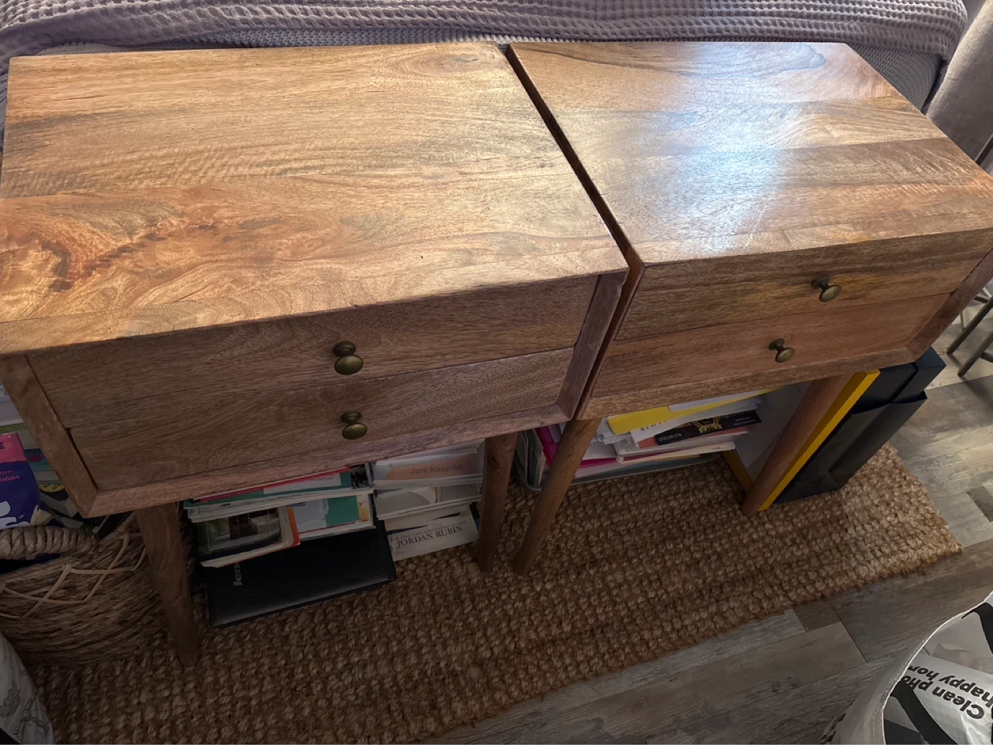 Set of 2 matching Rishabh Handicrafts nightstands. Real wood and features two drawers with brass colored handles with electrical built-in USB ports, power outlets, which is super convenient. (manufacturing date is January 2022) Made in India. Excellent shape, like new!
