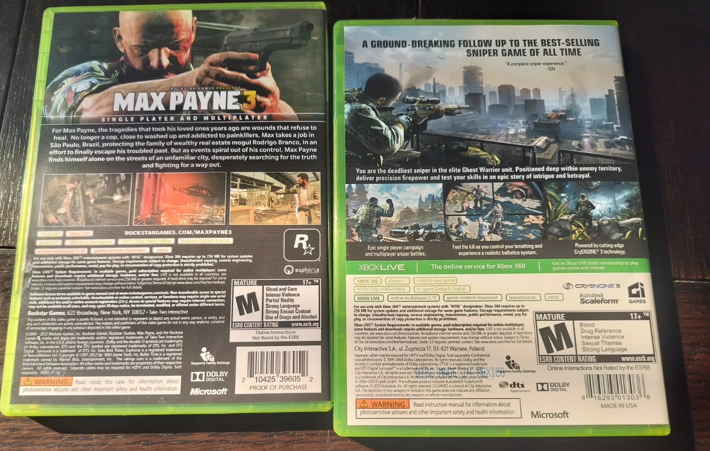 Buy & SellXbox 360 Games: Max Payne 3 and Sniper Ghost Warrior 2 🏆Xbox 360 Games: Max Payne 3 and Sniper Ghost Warrior 2 🏆$15Two Xbox 360 video games: Max Payne 3 and Sniper Ghost Warrior 2. Both are rated Mature 17+ by ESRB. They're for the Xbox 360 console.WHERE TO MEETSt.Helens churchView MapSELLERverifiedMichaelLindenwood1275 reviews0 chats·0 favorites·6 viewsSEND CHAT TO SELLERHi Michael! I’m interested in your listing.Hi Michael! I’m interested in your listing.Get the Karrot app to chatSign In to chat