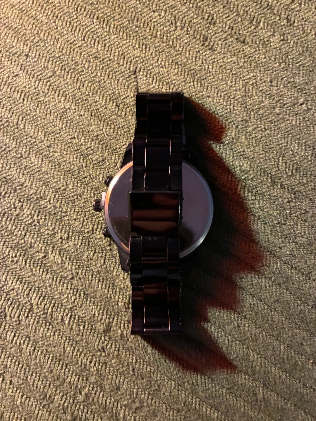 This black watch has a metal band and chronograph display. It features a black dial with silver-tone hands and markers. The band is adjustable for a comfortable fit.