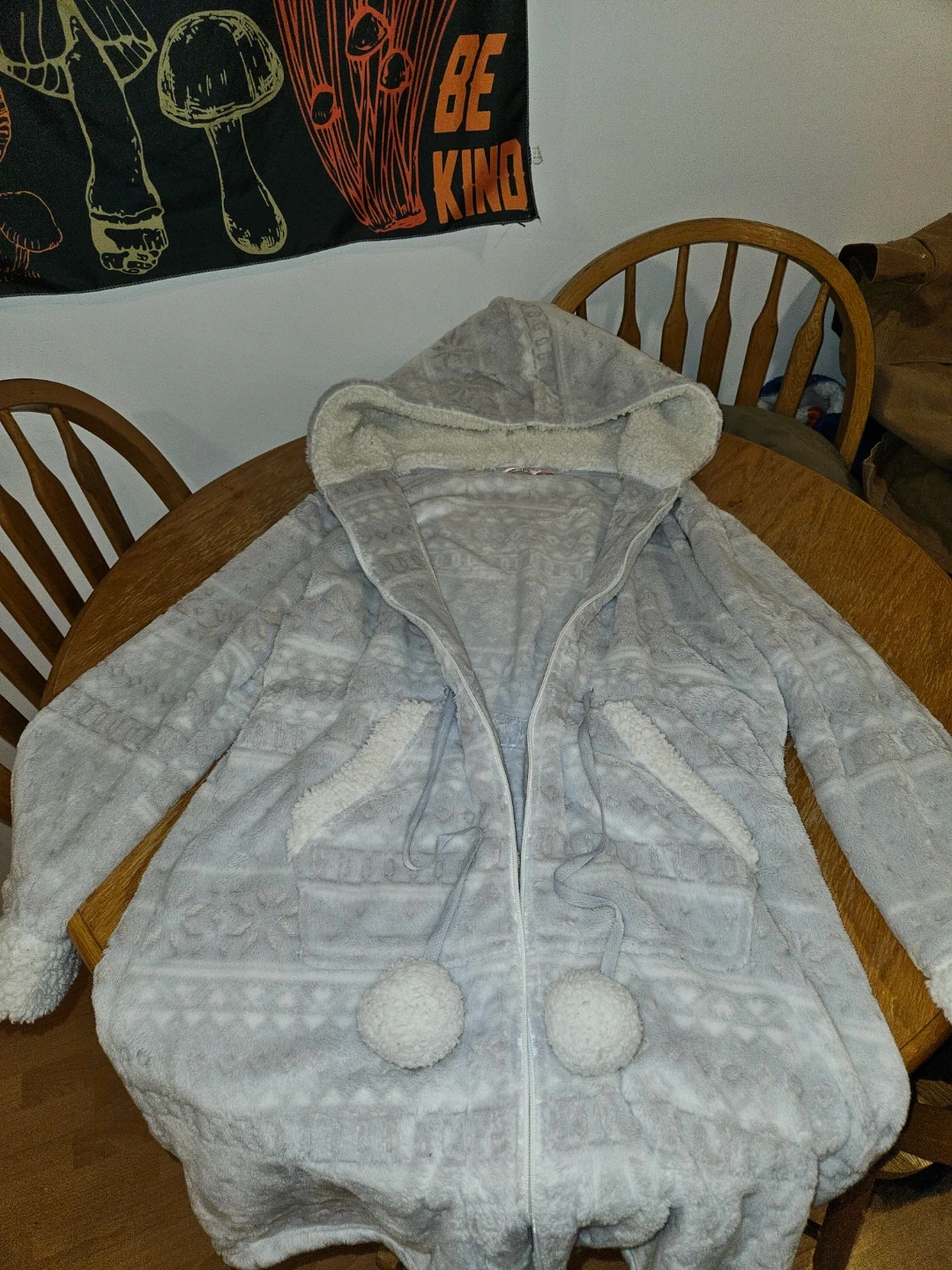 Cozy La Vie en Rose robe with a full zip front. It's a size L/G and made with soft fleece material. Features fuzzy pom-poms on the drawstrings and a sherpa-lined hood.